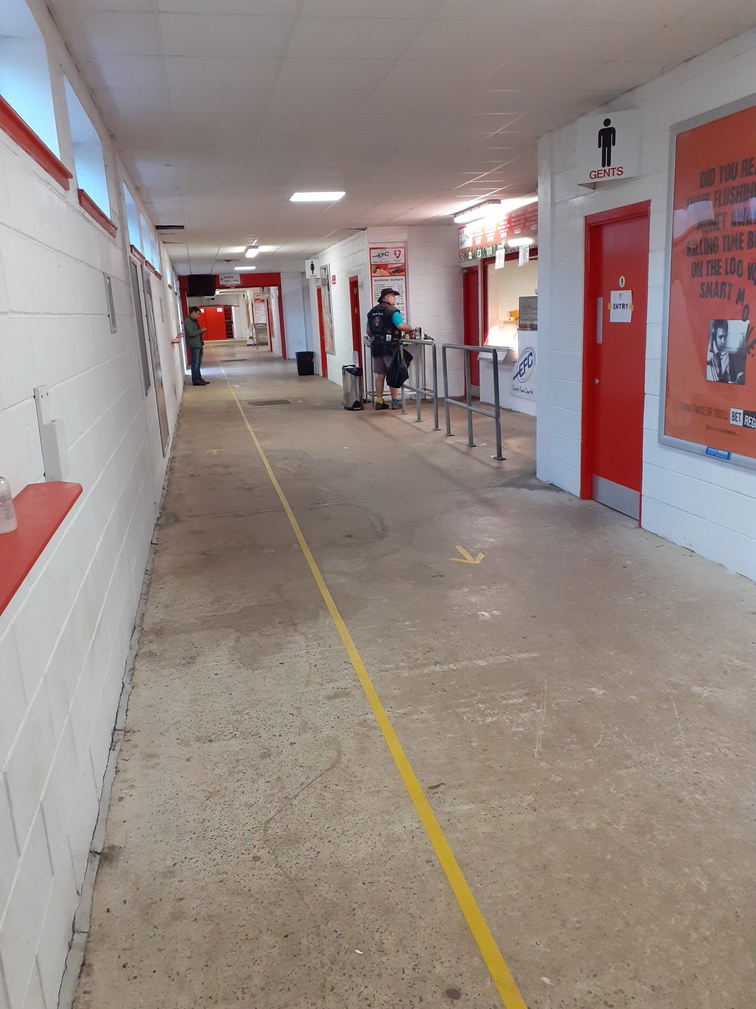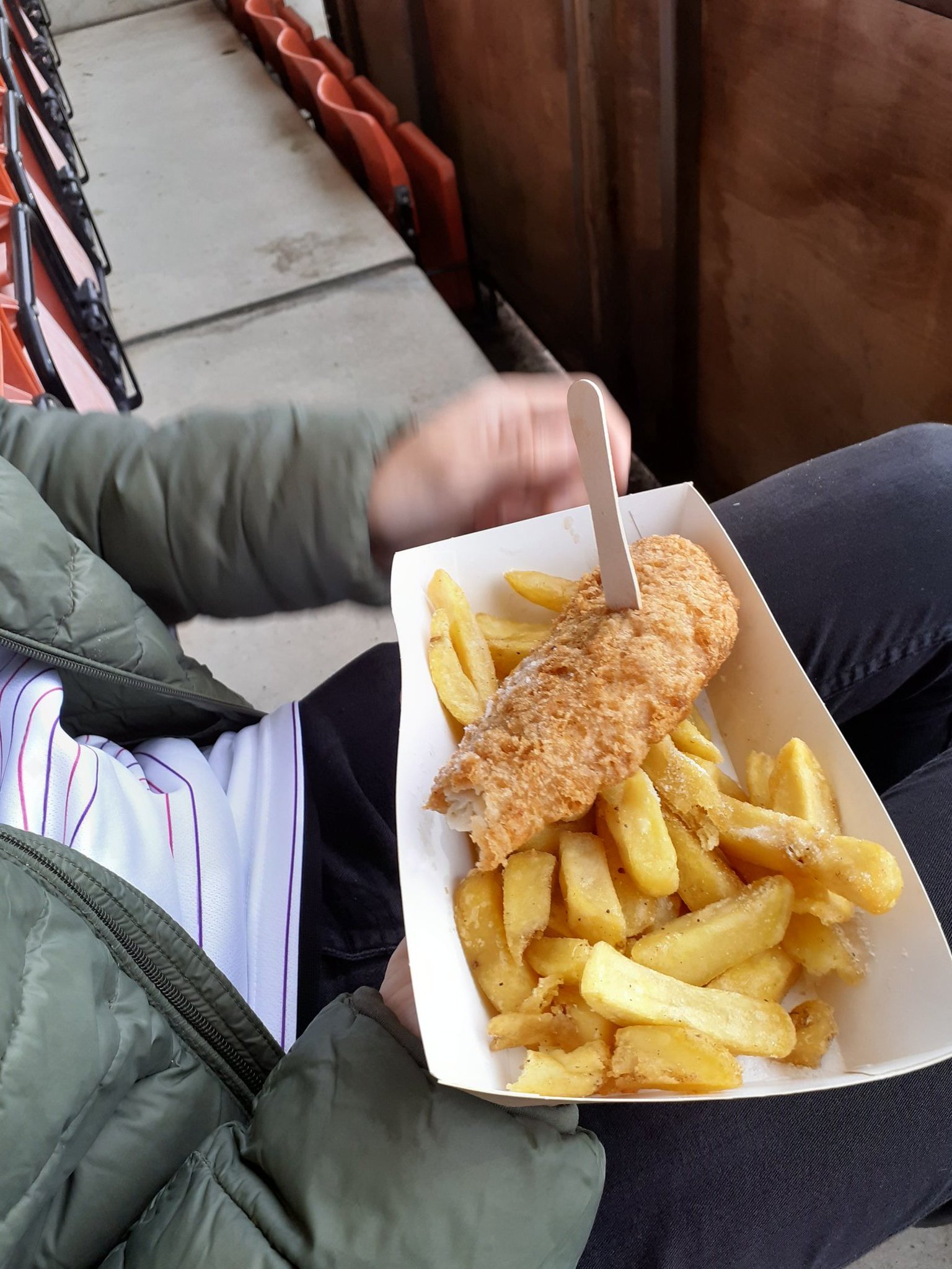 When we’ve successfully negotiated our way back to the entrance where we started, we head into the Colin Farmer stand. The turnstiles are a bit tight. To the point that Maria almost got stuck going through and I hear a “honey, help” from behind me. If you’re a gentleman of sizeable girth, you’ll struggle to get into the Jonny Rocks. We proceed into the concourse, and it occurs to me that I never take photos of the concourse. This is a basic one. There’s toilets and an eatery called the “Grillhouse” that charges big cash for meal deals. Josh had fish and chips; you can see both pictured below. He didn’t eat the chips, but I think he was just being picky.