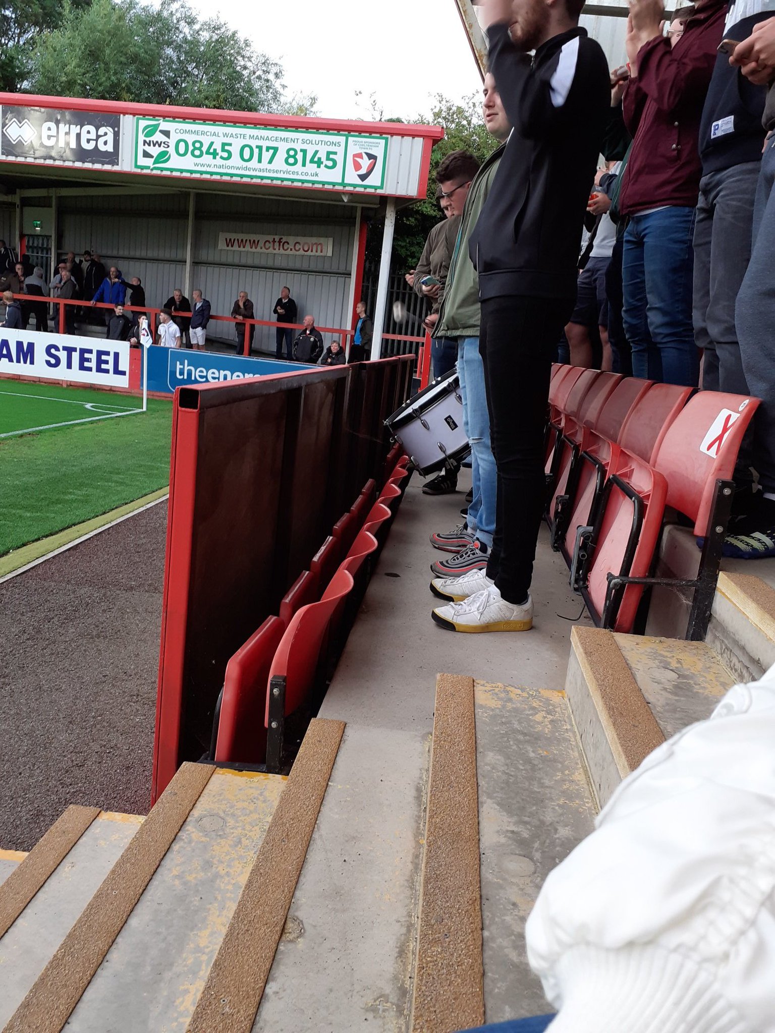 Josh quickly adapts to his support of Cheltenham Town and I see him kissing his badge. As a Chelsea supporter I suppose that’s fair game. They both start “Chel”. We’re right by the 1887 Red Army, which is Cheltenham’s ultra group. They have a drum with them and start chanting early and keep at it. The first half isn’t great for Cheltenham. They peak with the warm ups.