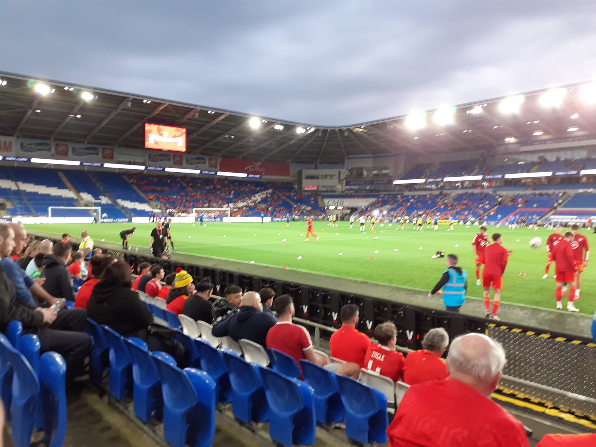 We get to our seats and I’ve nailed the location on them. Row seven, just about under the roof, and a sensational view. Alex is jazzed claiming she’s never had seats this good for anything. Her infectious smile in the build-up is worth the extra fiver for each ticket to get this close. Another key occurrence, which should sell even the coldest of hearts on International football, is the Welsh national anthem. There’s no music playing, the crowd just bang it out themselves and holy shit, it’s spine-tingling.