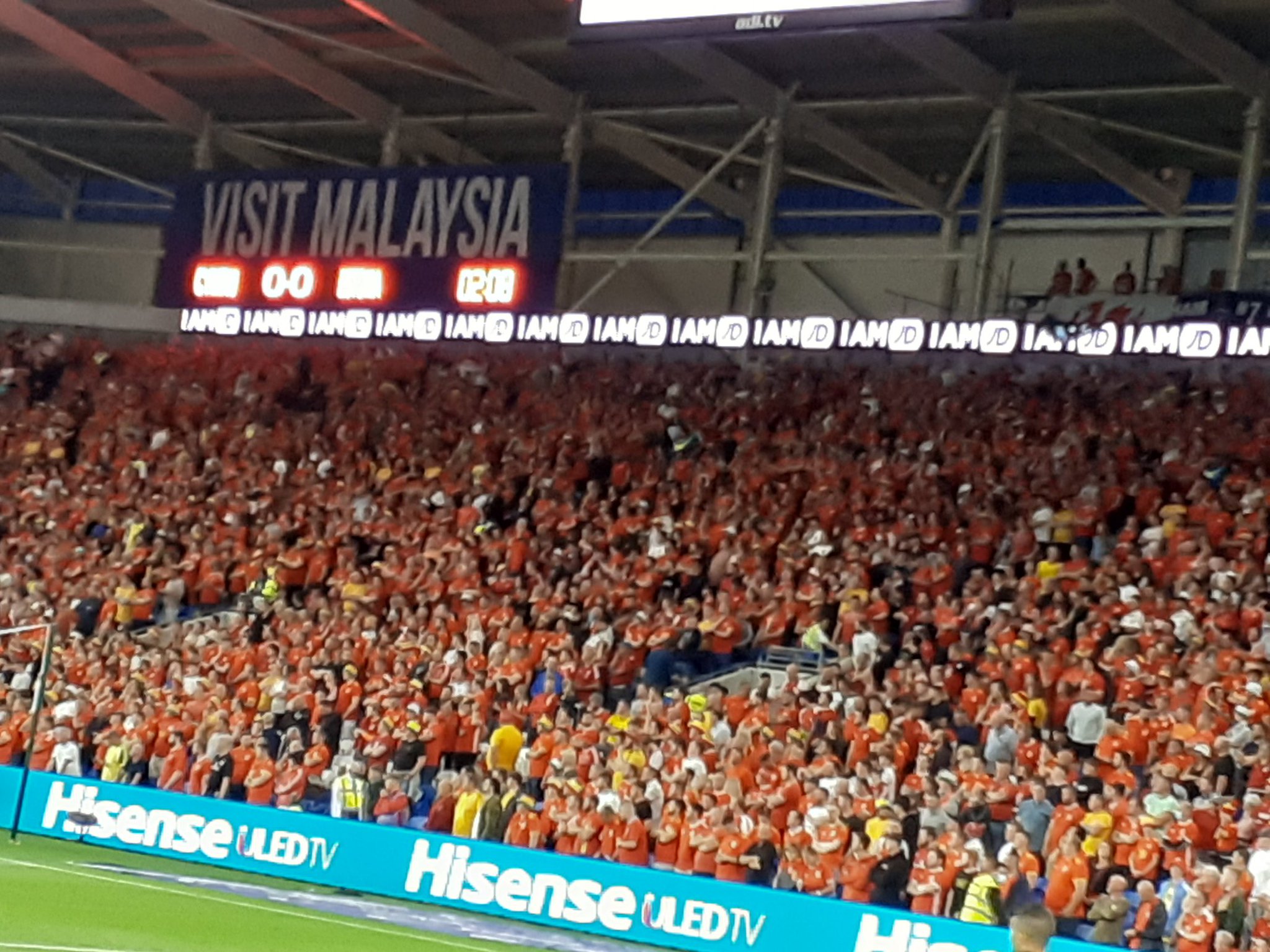 The patriotism of Welsh fans is very clear to see and it’s not just banging out the anthem like they do. You see red everywhere. On all four sides it was just a sea of red. I felt bad for forgetting to bring my London Jets shirt, which is the only article of red clothing I own. You can see from the photo what an enormous percentage of the fans were wearing red. You love to see it.