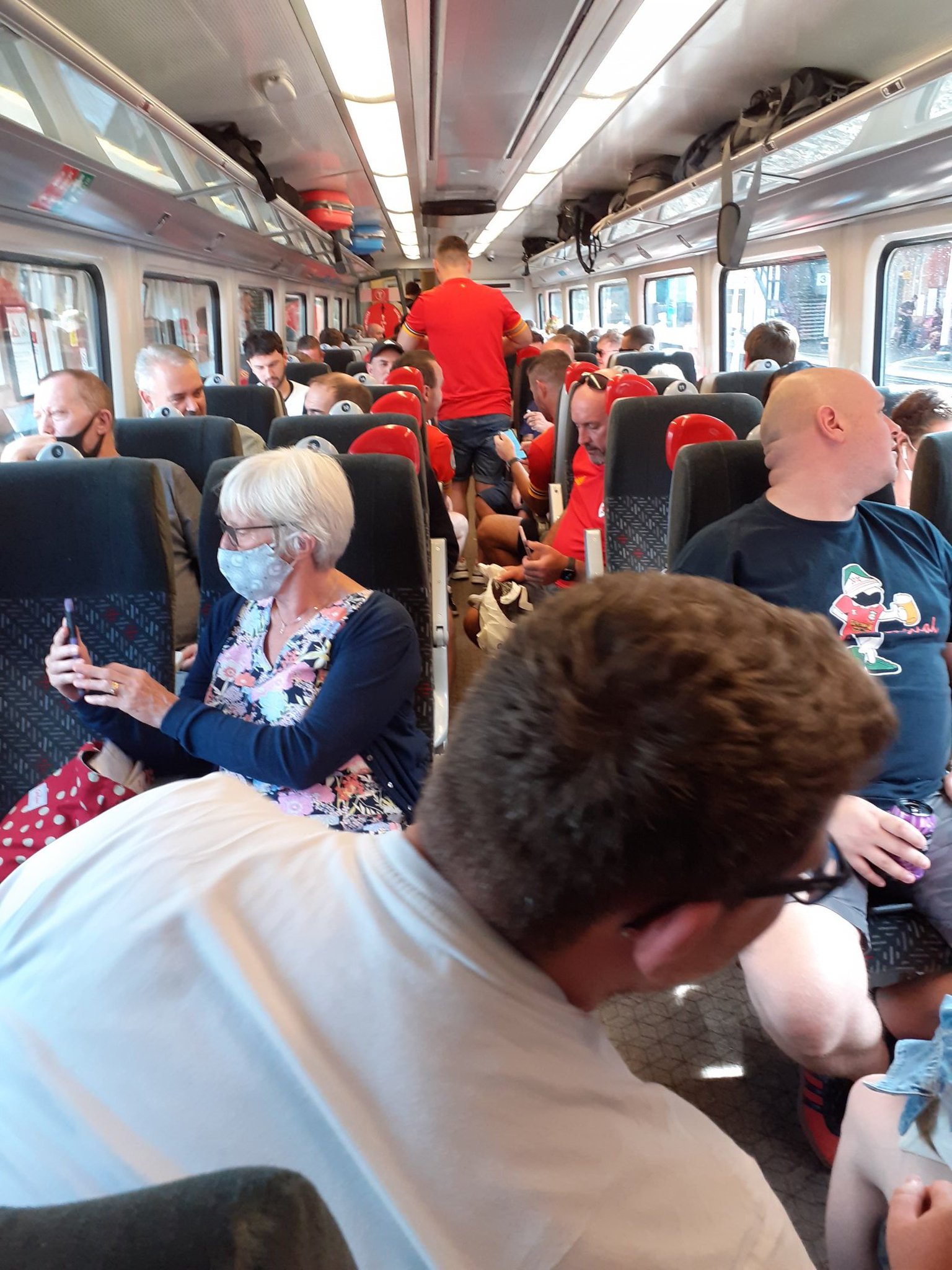 The next train is coming down from Manchester and is full of people from North Wales. It was like stepping into a club. There’s only two coaches and it’s roasting on this train. It’s packed full of Wales fans. There’s a lot of beer being drunk and the lads are in good voice. I overheard one say it was a six hour journey for them. Travelling on a train full of fans is a great way to learn some chants, I’ll say that much. My favourite is “Viva Gareth Bale! Viva Gareth Bale! He said he had a bad back, fuck the Union Jack, viva Gareth Bale!” When it’s sung at him later he gives the crowd a thumbs up.