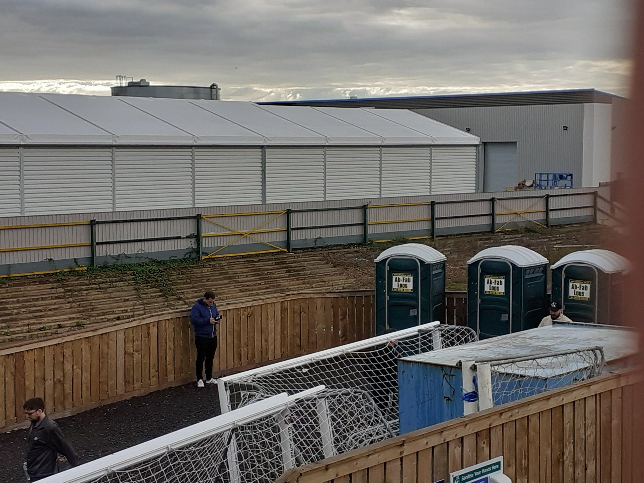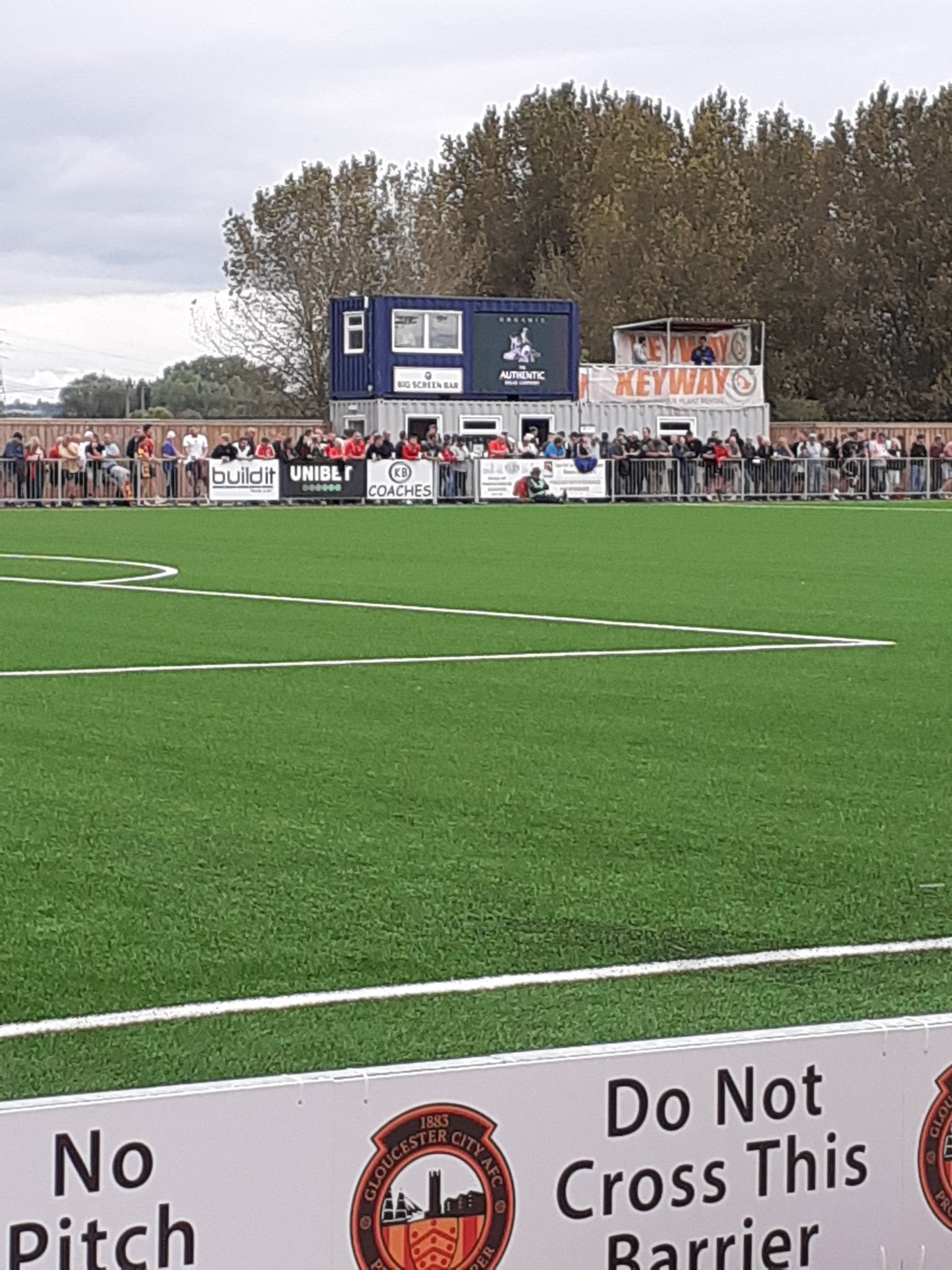 Opposite us is the Big Screen Bar, which looks suspiciously like a container with another container stacked on top. The big screen does work and displays the score and time throughout the game. On our side are two large stands (City Stand and the 1883), either side of the 1883 bar. The back of which has the changing rooms in it. I know this because we walked past it and could see players inside. Off to our right is the ‘Gloucester City End’. I’m reticent to call it the home end because technically Longlevens are at home. It’s known locally as the T-End.
