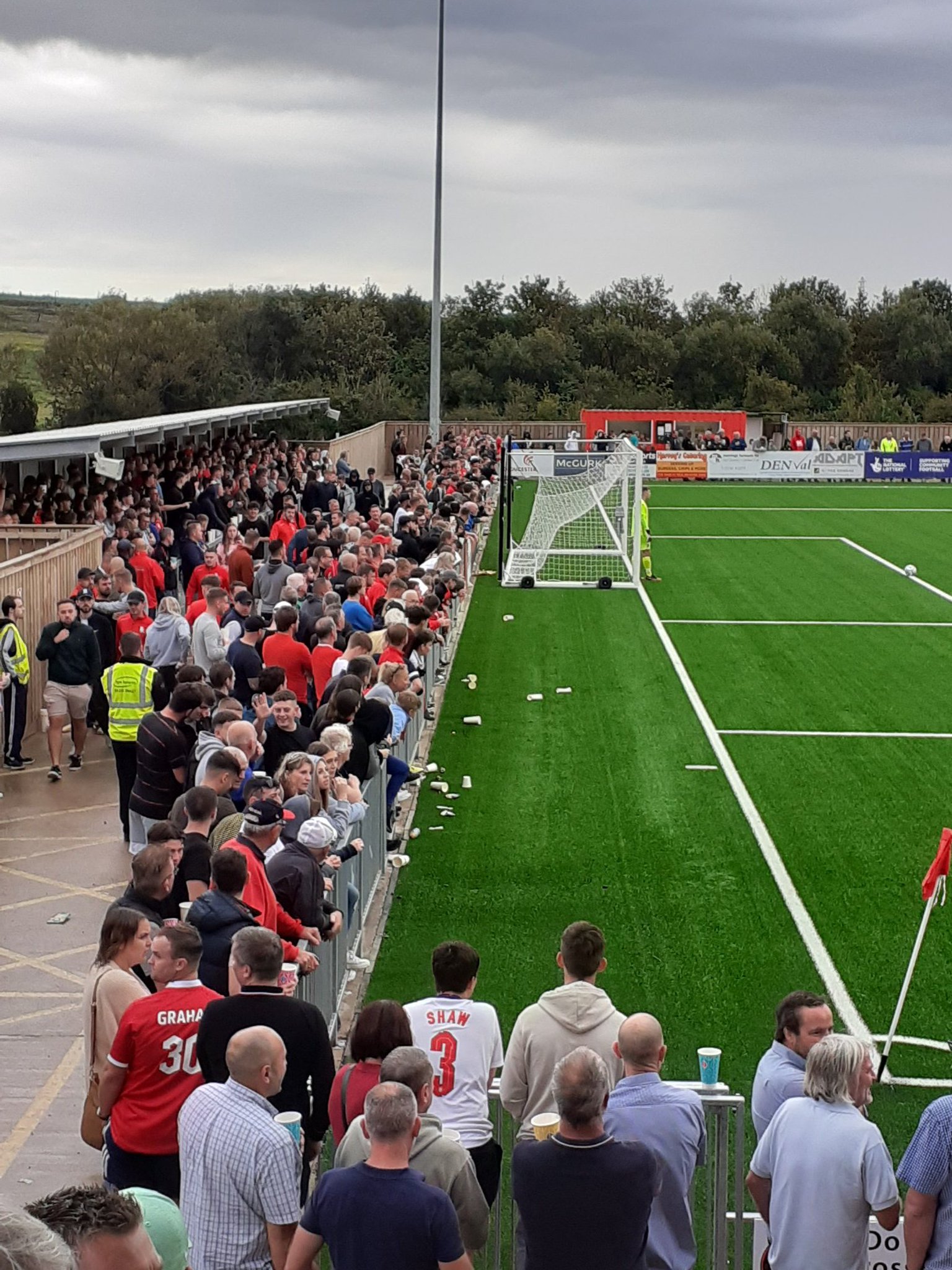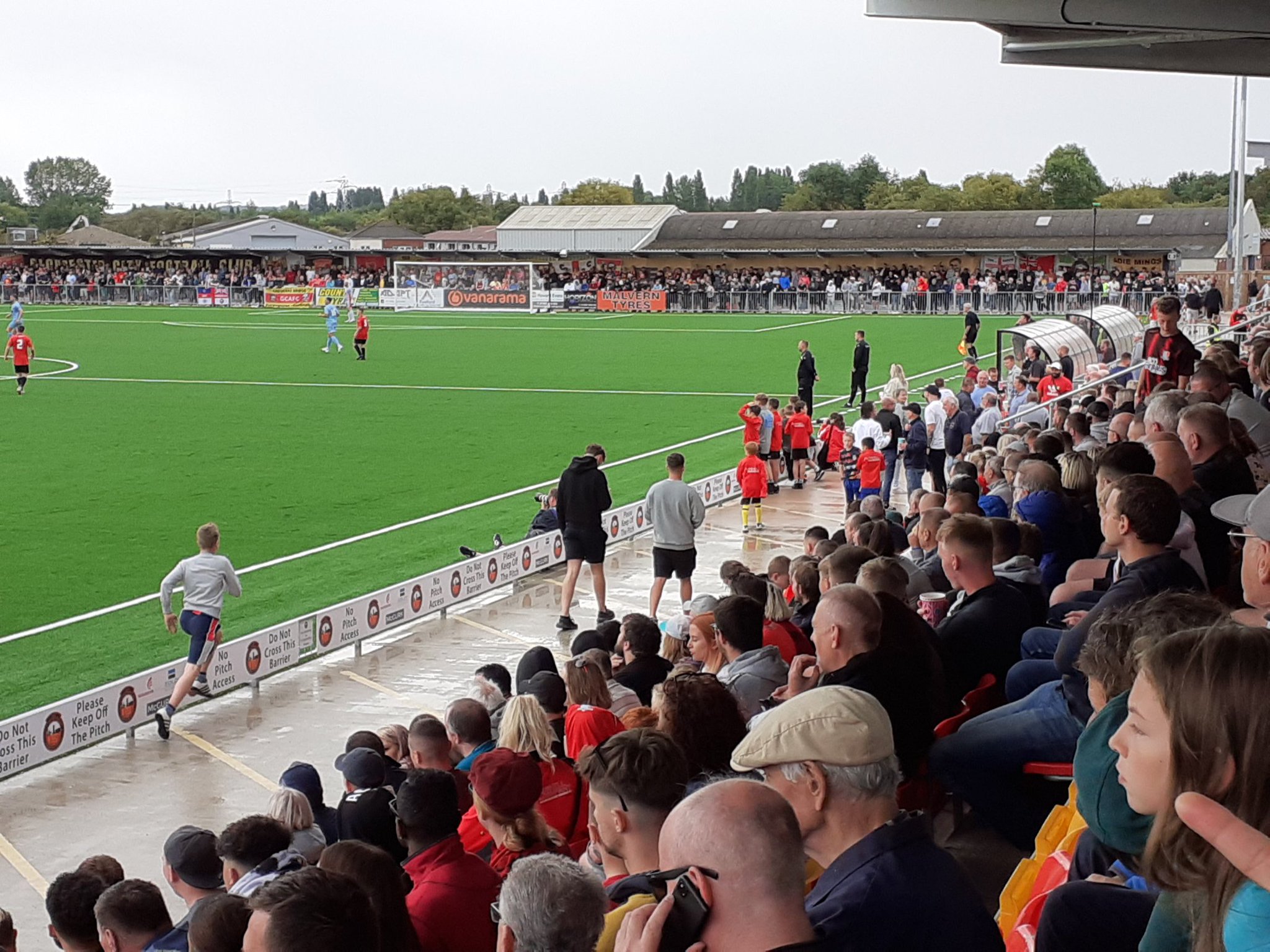 It’s a big, big crowd for this ground, 2,320 announced, and it’s mixed with supporters from each team rubbing shoulders with each other. For two close neighbours some are fans of both teams. Although it’s clear early on that Longlevens are the crowd favourites as they’re massive underdogs. The club are treating it as a day out and the ‘happy to be here’ vibe is everywhere. I’m struck by how everyone seems to know each other. I lose count of the amount of people that walk past and wave at someone behind me in the stand.
