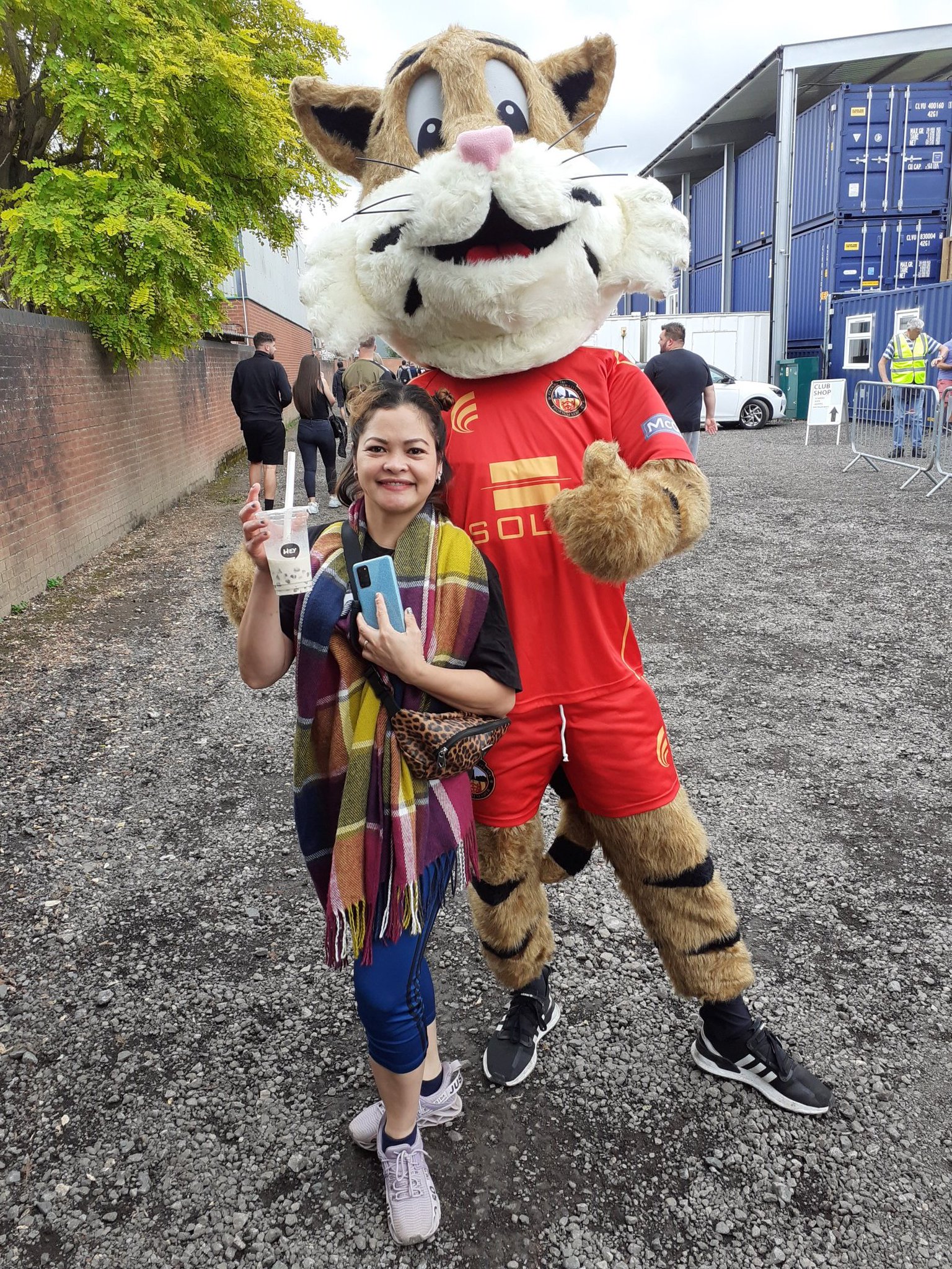 We get mark pics with the mascot, whose name I can’t find and get our wristbands, which are required to prove you have a seat. Mine takes a few hairs out of my forearm. I’m a bit miffed nobody checks it either. We walk straight into the ground and just sit down in the front row by the corner. I feel like they would be decent seats if any goals are scored at that end. I am very wrong. The ground has astro turf and mobile goals, which are two things the purist in me cannot stand.