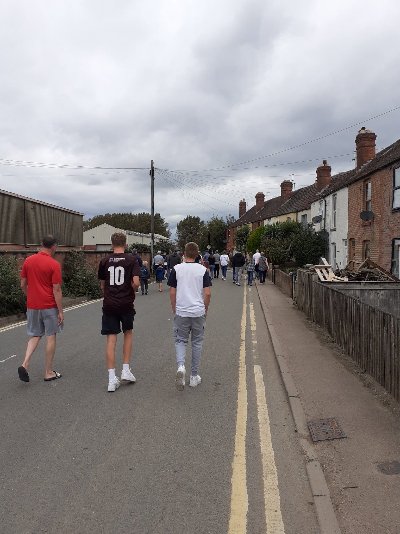 Three divisions separate Gloucester and Longlevens. The latter were actually drawn at home but opted to play the game at Gloucester as only three miles separate the two grounds. Gloucester isn’t that far from me either and we casually leave the house at 1.15pm, fill up on petrol and still get into Gloucester with time to spare. That’s with some odd road closures and being buzzed by a landing helicopter on the A40. The club recommend parking at the local Sainsbury’s because it has three hours free parking, and we comfortably get out inside three hours. Great tip. The walk to the ground includes strolling down a pathway between residential and the back of a factory.