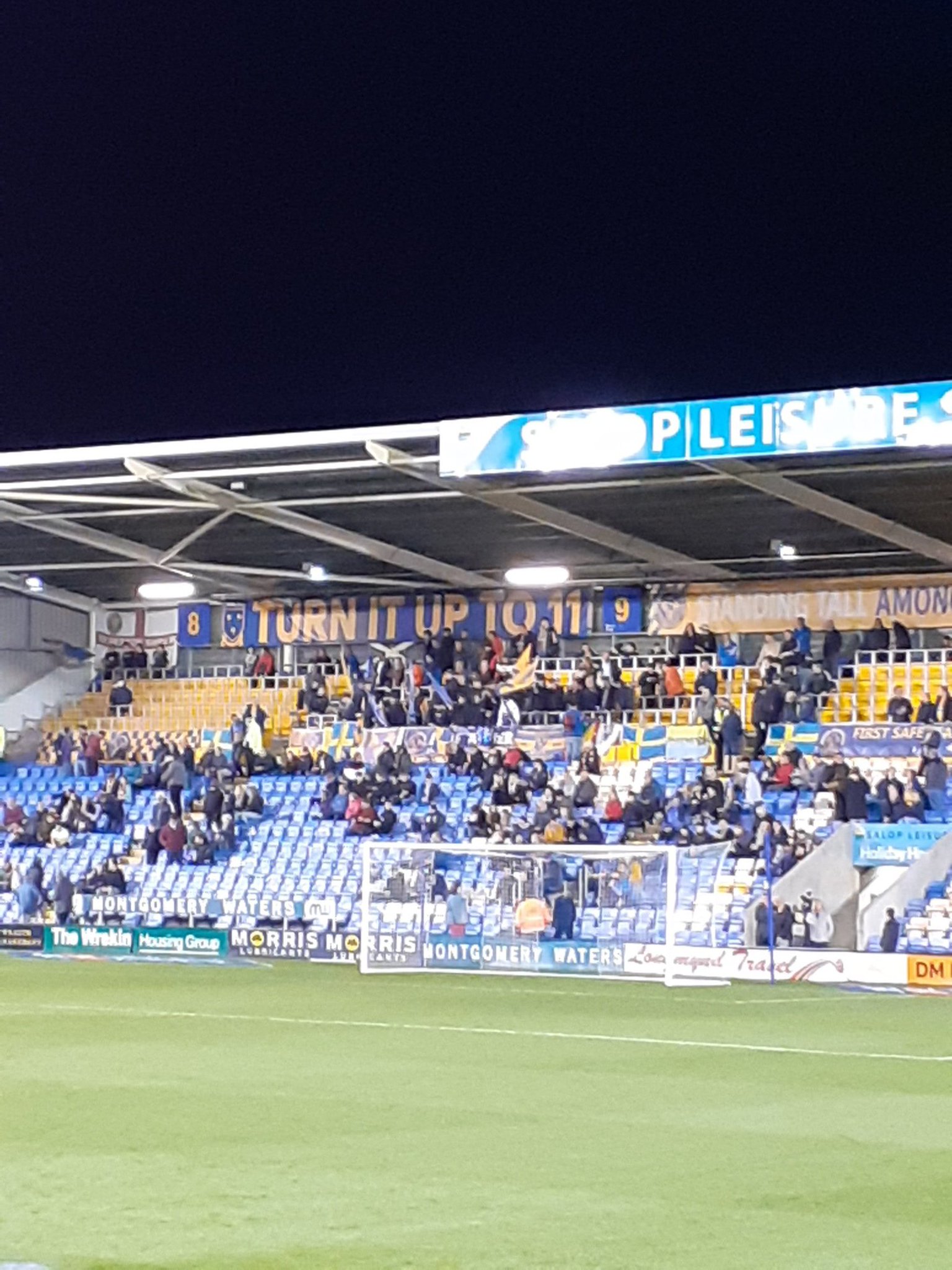The rambunctious home support featured a lot of flag waving and noise. You can see the banner behind them marked “Turn it up to 11” in a tip of the hat to spoof rockers Spinal Tap. The one to the right reads “Standing Tall Among Giants”. Shrewsbury acquit themselves really well in the game. They play some delightful football. Shaun Whalley in particular has a good game. However there’s no end product. They create a dozen half chances but never really bother the keeper.