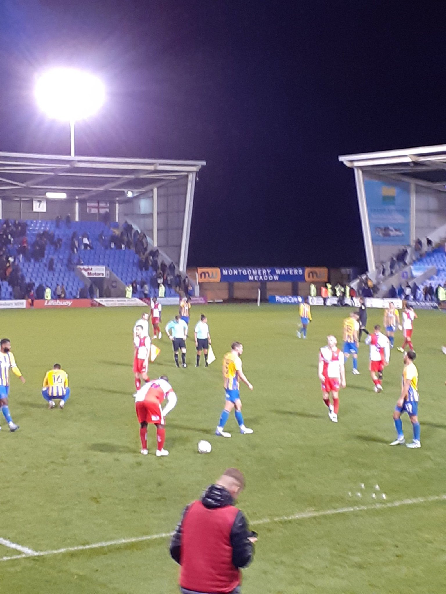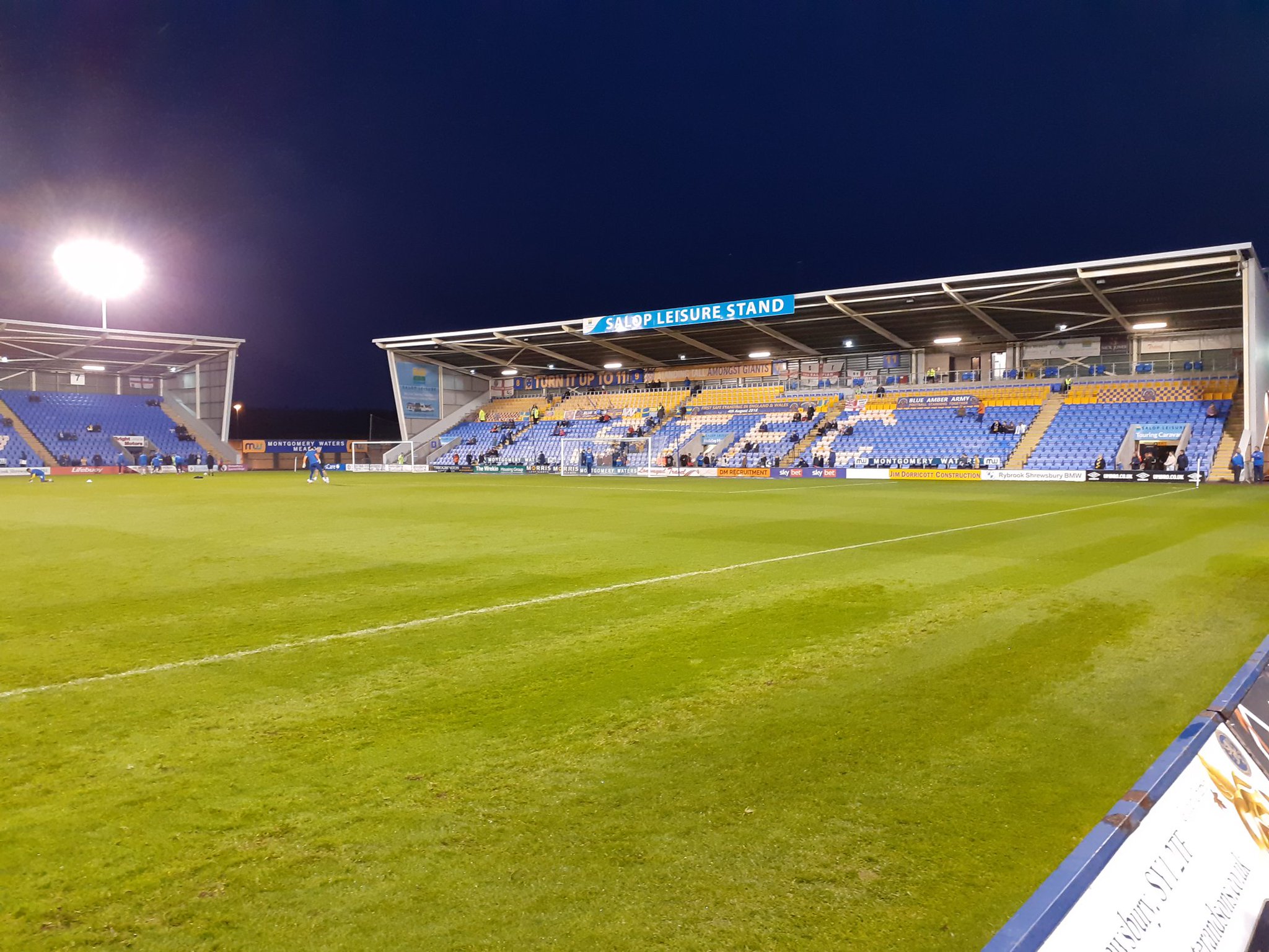 Come game time the temperature had dropped to around 10-11 degrees C and for the first time this season I felt a little chilly. You could see your breath! The crowd won me over almost immediately with a sense of passion and the knee was respected on all four sides. I can confirm that both Shrewsbury and Wycombe are decent lads. The atmosphere was really good and this is with a crowd of only 4,510 for a damp Tuesday evening game. I imagine it’s really rocking on a Saturday afternoon.