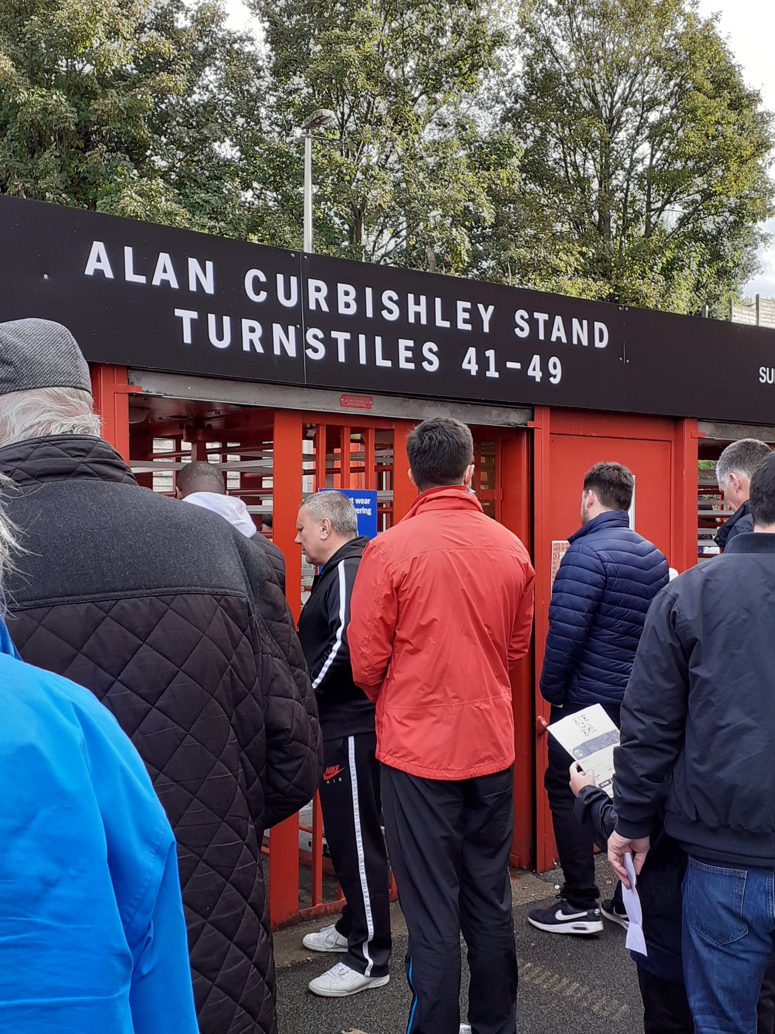 Here comes the moment of truth. Will I get in with a bag? I’ve purposely brought a bag that’s not in great condition in case I have to stow it somewhere. The turnstiles at the Alan Curbishley stand are not manned and the printed tickets scan first time, which is a winner. You can see a chap holding one to the right there. The bag check is after that where a friendly steward asks to see inside and pops a pink “bag checked” label on it. I ask what happens if I don’t have a pink label. “I get in trouble” he replies.