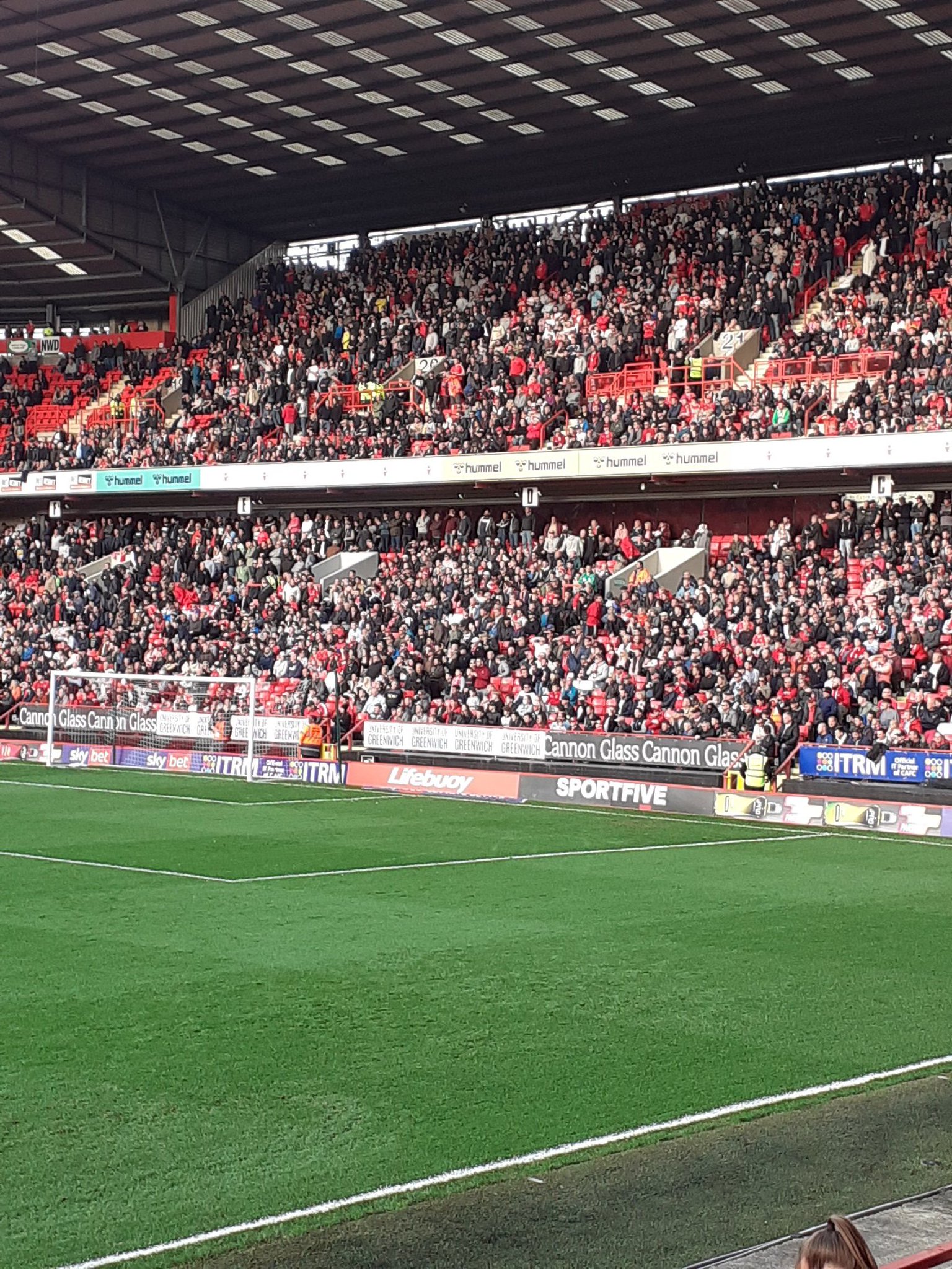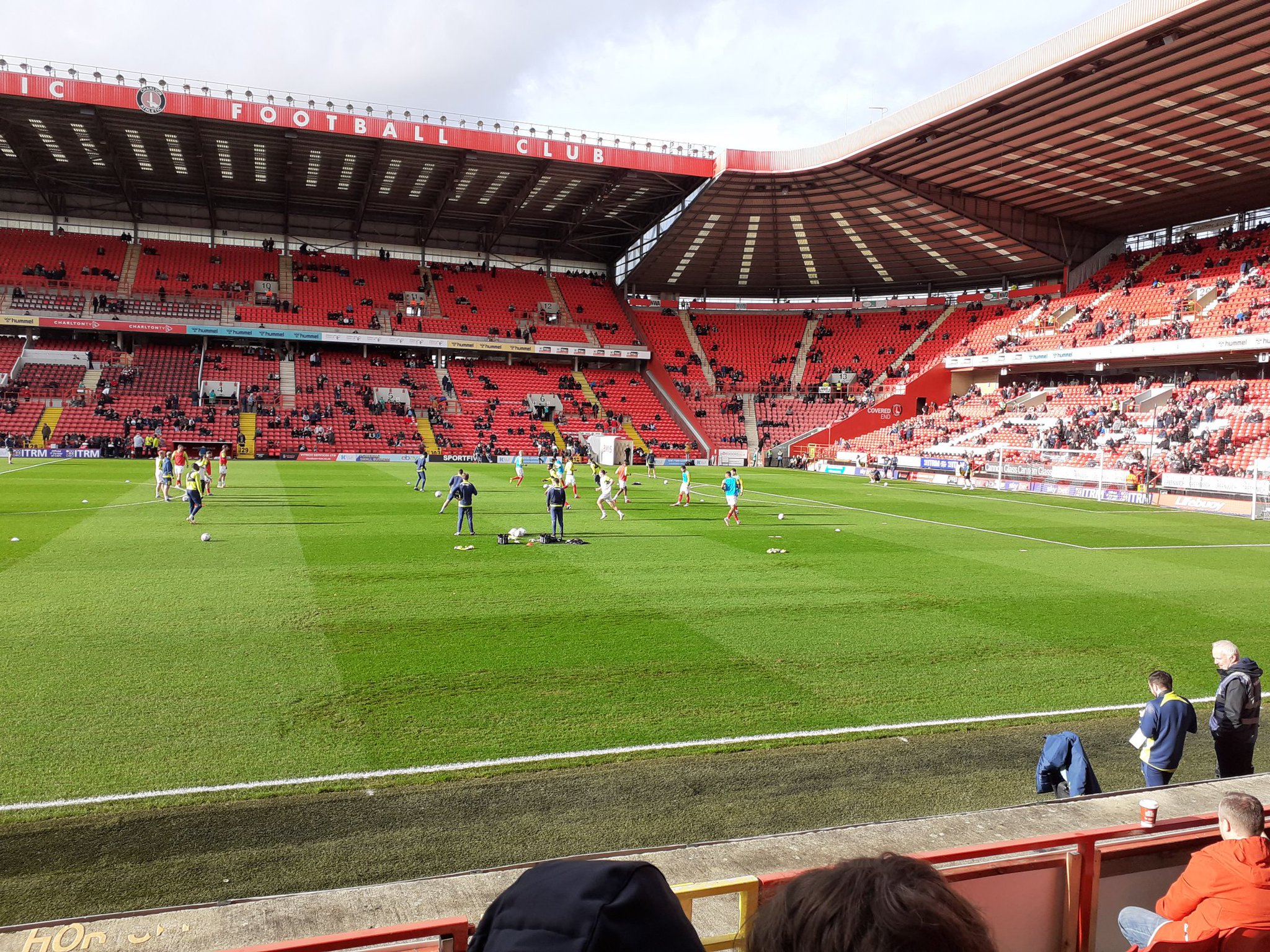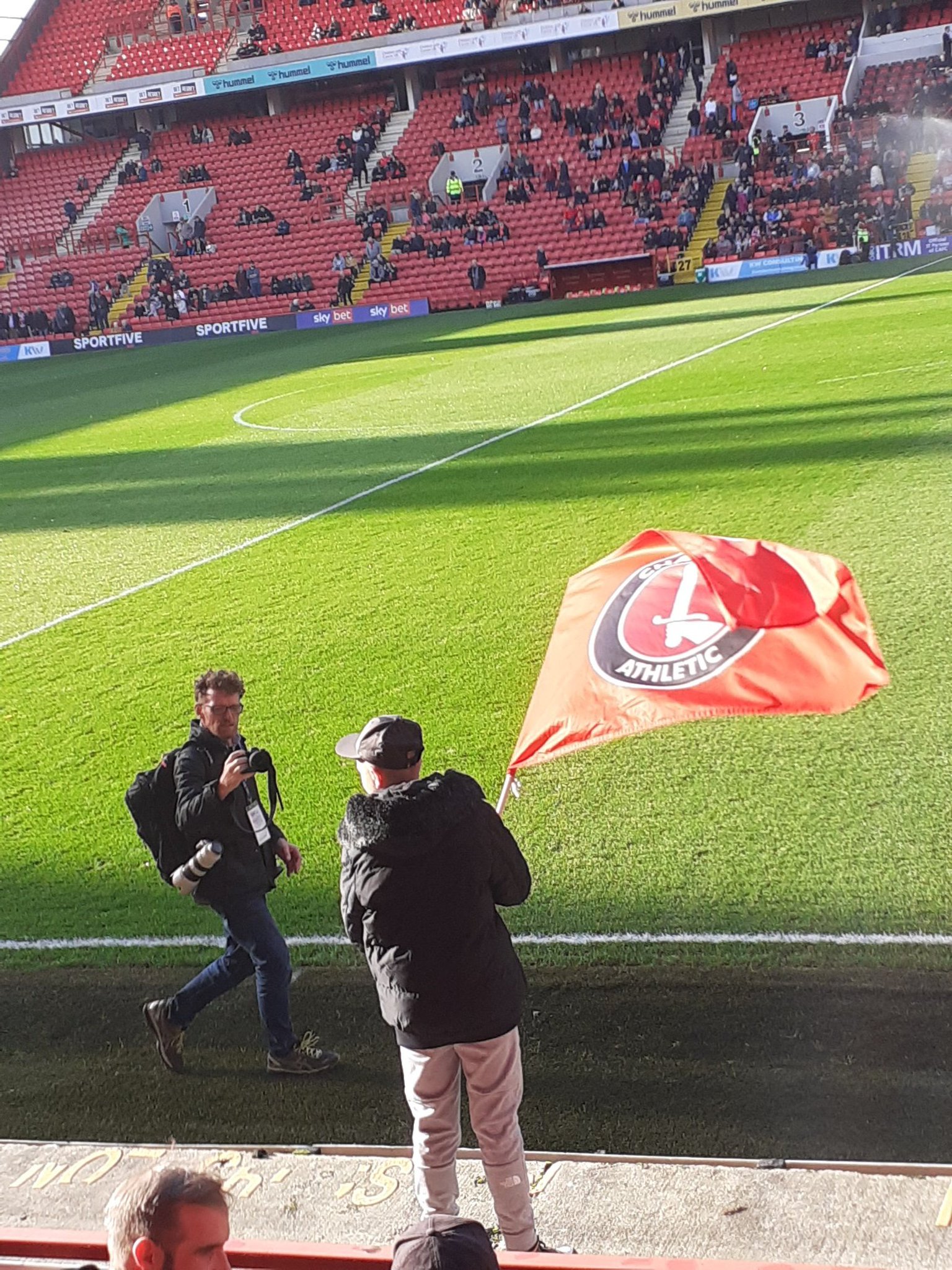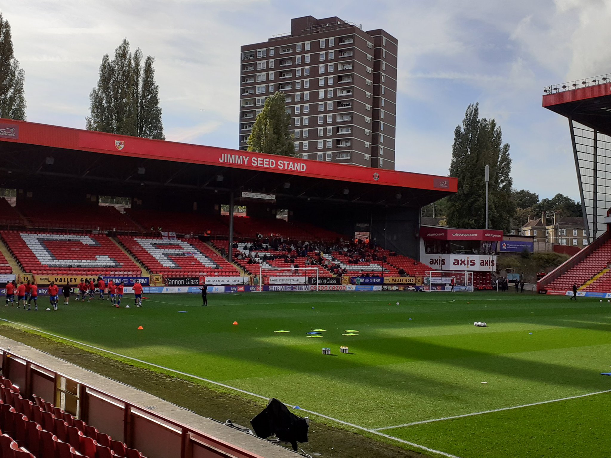 The ticketing system is a little confusing. We’re in block ESE. There is no block ESE. I ask another helpful steward (they’re really good at Charlton, big thumbs up) and he helpfully directs me into a nearby entrance. We were in the right place first time! The Alan Curbishley Stand is a beast; but all the stands are at Charlton, barring the away end, pictured above, the “Jimmy Seed Stand”. It’s tiny compared to the rest of the ground and allows a decent view of the pitch if you happen to live in the block of flats behind it. I noticed at least two punters watching for free up there.