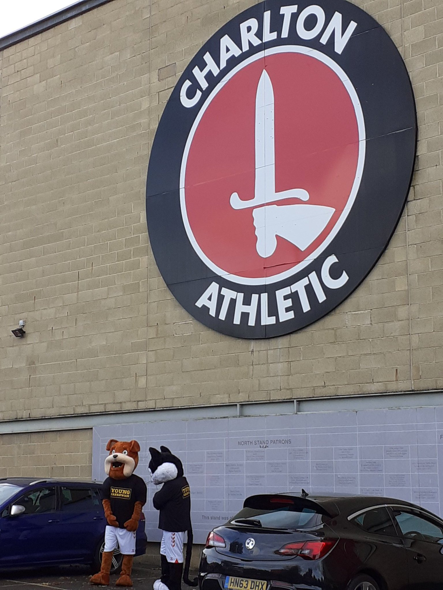 Charlton has a good community feel to it. They posted a message on Twitter detailing the places where families could go and get photos taken with the clubs mascots; Floyd and Harvey. I thought it was Harley as the cat is clearly a lady with that lovely bow. I also love a giant badge adorning a wall. I like Charlton’s badge in general. It’s a simple one with a bloke holding a sword but it works. It looks great on the club jackets that seem to be more popular than replica shirts around the Valley.