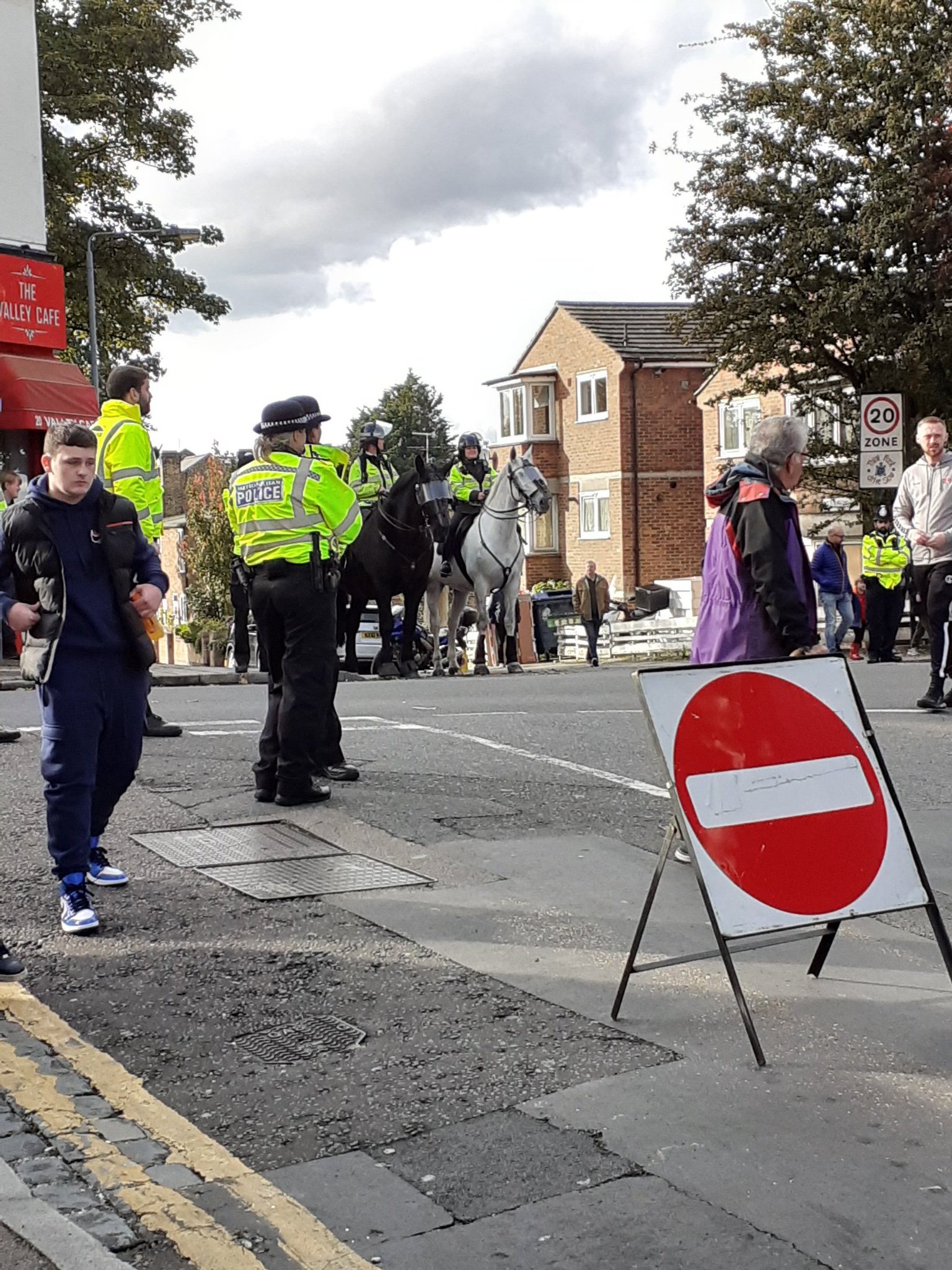 On arriving in Charlton I’m greeted by huge crowds and the largest police presence I’ve seen at a game all season. There are four riot vans parked outside the station and I see three sets of mounted police. The ones above between the Sainsbury’s, which I imagine is hell on match day, and the Valley Café. It’s on this spot I meet Lewis, aka “Welshie” (guess where he’s from?), who’s watching the game with me today. Both of our groundhopping adventures took a break in October. My last game was in Scotland some four weeks earlier and before a visit to West Ham in the Carabao Cup mid week, he’d not been to a game since late September.