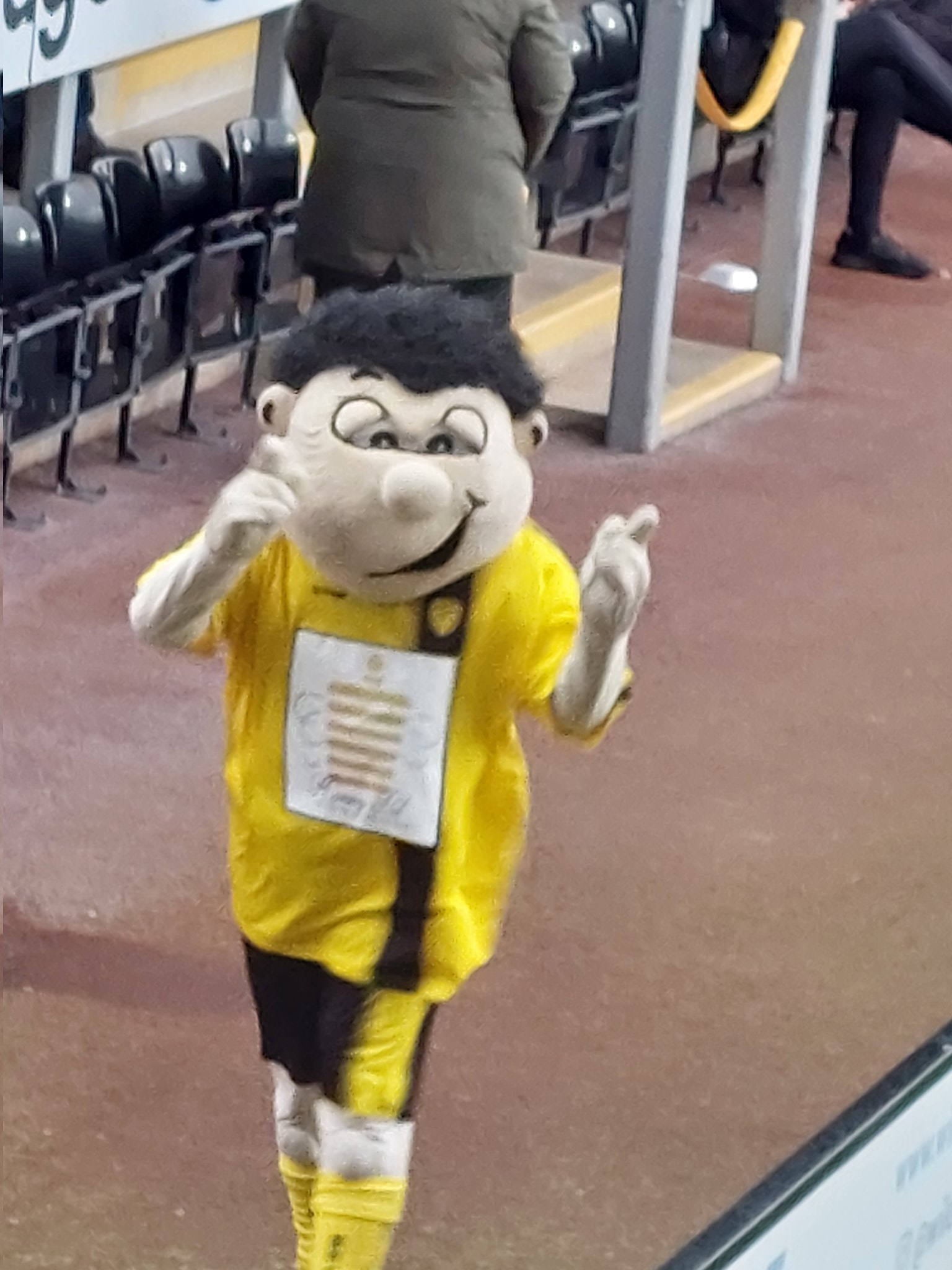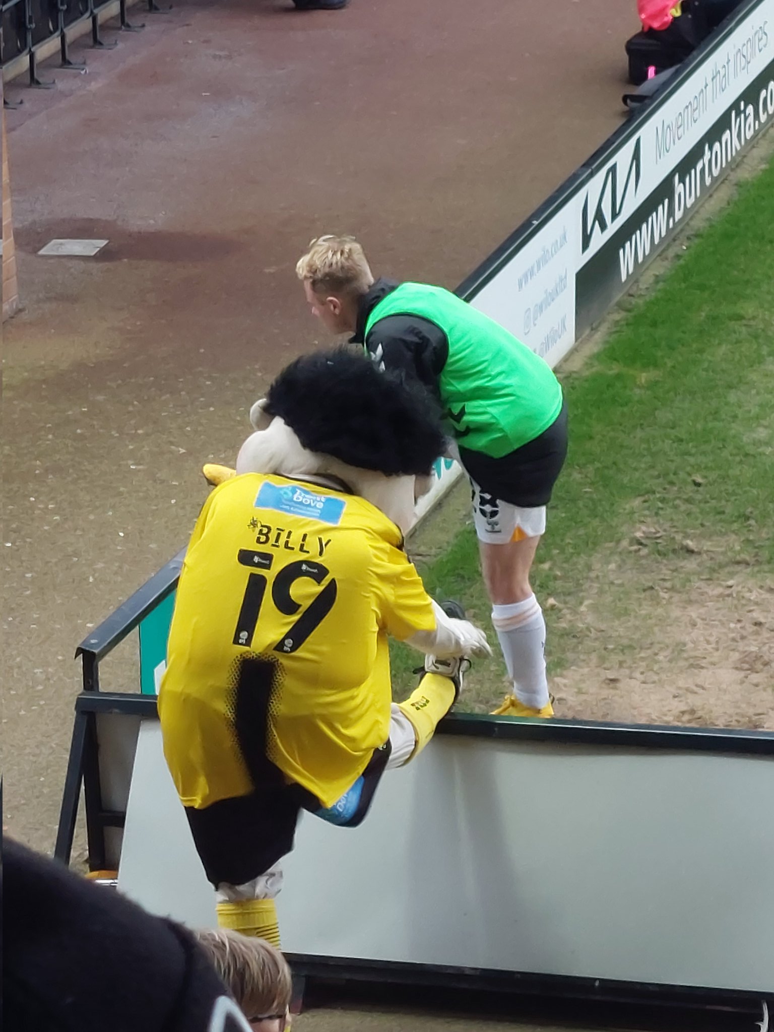The Burton mascot is Billy the Brewer. He’s a weird looking freakish thing with a lopsided face. I think it’s supposed to be some sort of mutated human who’s drank too much Marston’s Pedigree. My initial horror eventually softens as he’s one of the more active mascots I’ve seen all season. He’s running around, he’s making fun of people, he’s joining in chants, he’s in the crowd, he’s high fiving people, he’s having fun with the kids in the crowd. Appearances can be deceiving. My the end of the 90 minutes I reckon Billy has worked his way into my heart.
