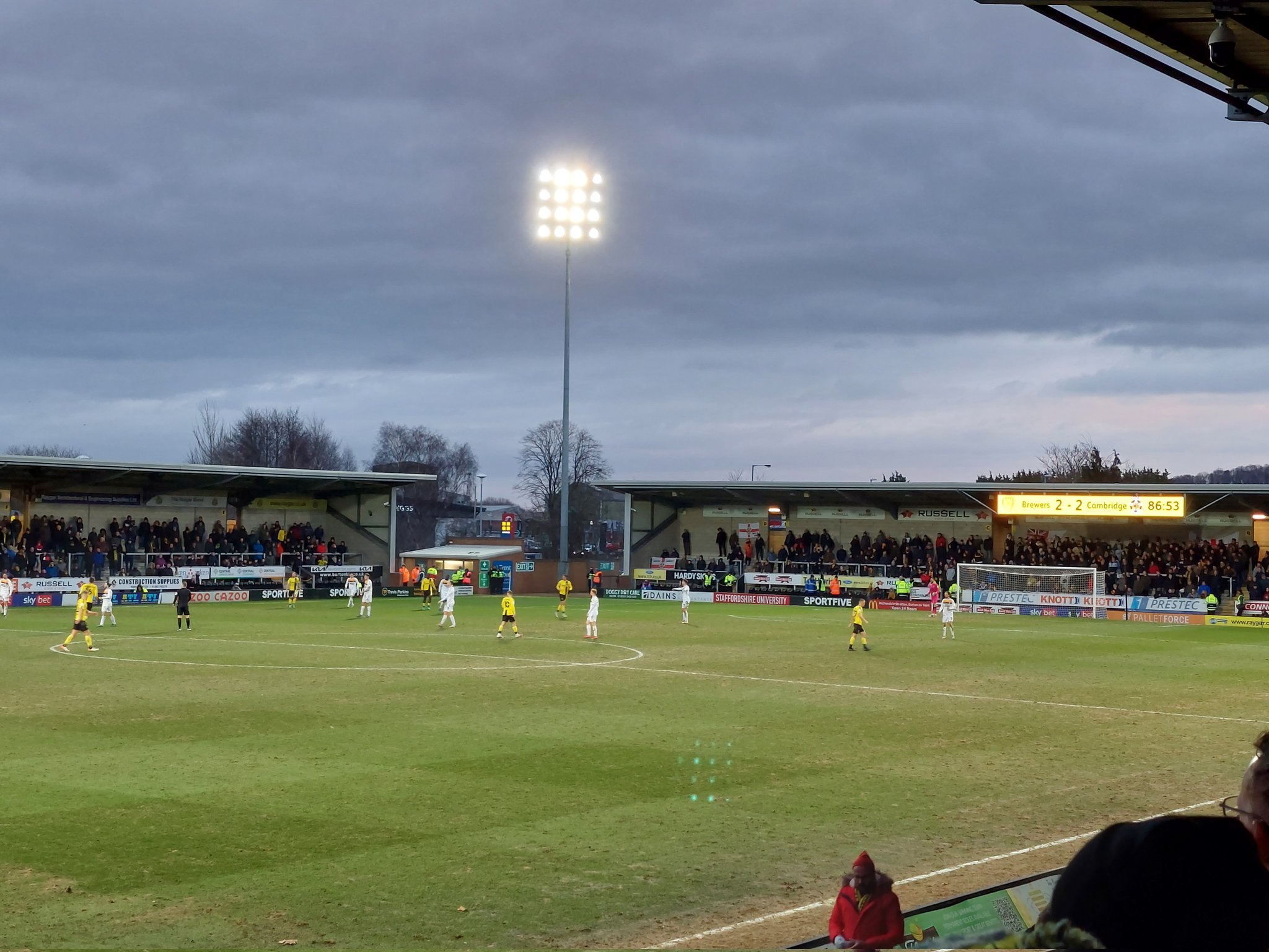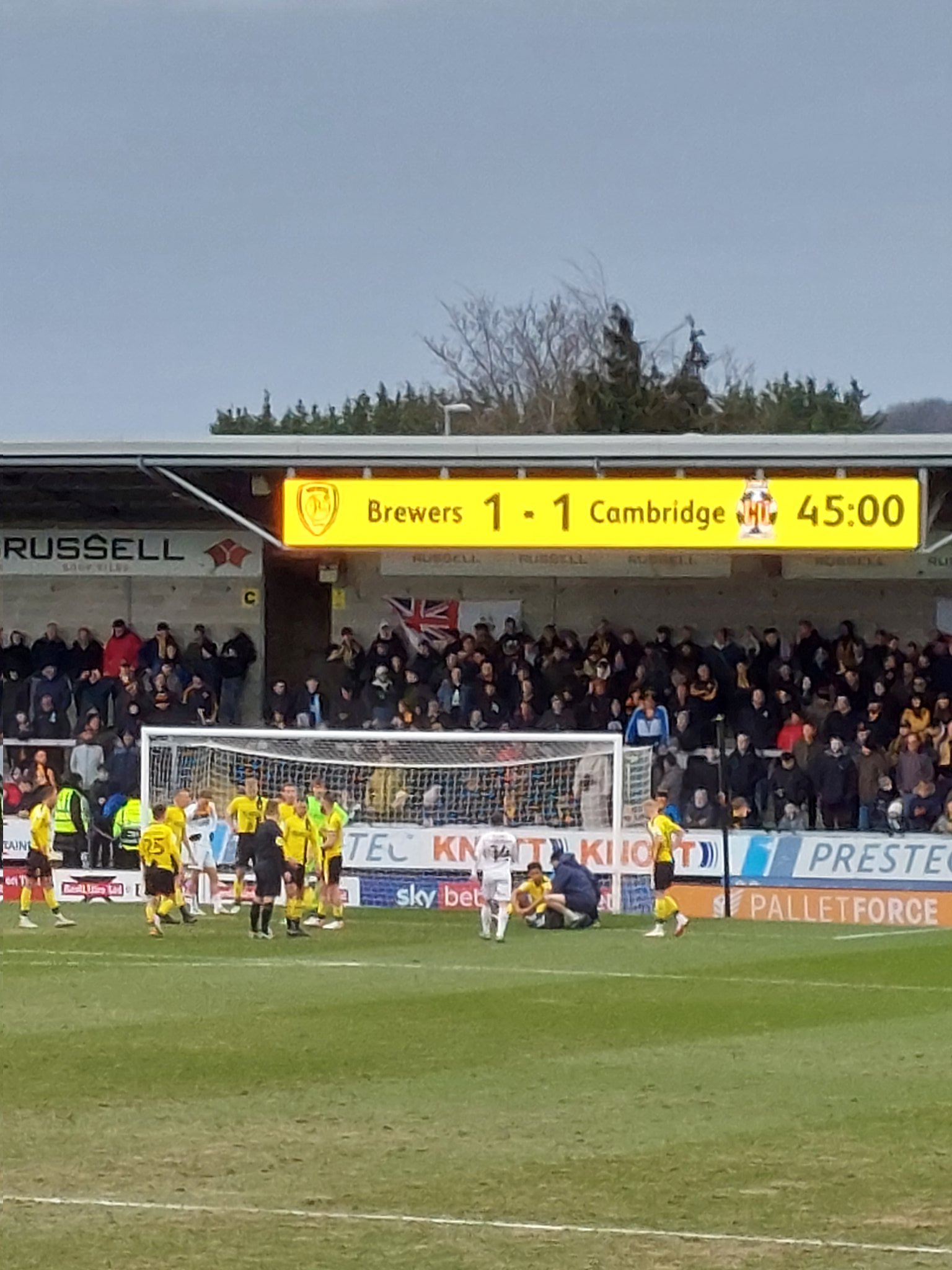 Not that Burton need him. They win a penalty after 20 seconds and it’s despatched by Gassan Ahadme. Hey, I picked him out as one to watch! He did a Panenka and almost fucked it up. Anyway, 1-0 to the Brewers. Cameron Borthwick-Jackson, another of my ‘ones to watch’ couldn’t carry on after getting smacked in the head. He was substituted via concussion protocols after spending roughly five minutes down in front of the unsympathetic Cambridge fans. The substitution was brought to you by Doggy Daycare Burton. This brings a loud cheer from the ultras followed by barking noises. I like it here.
