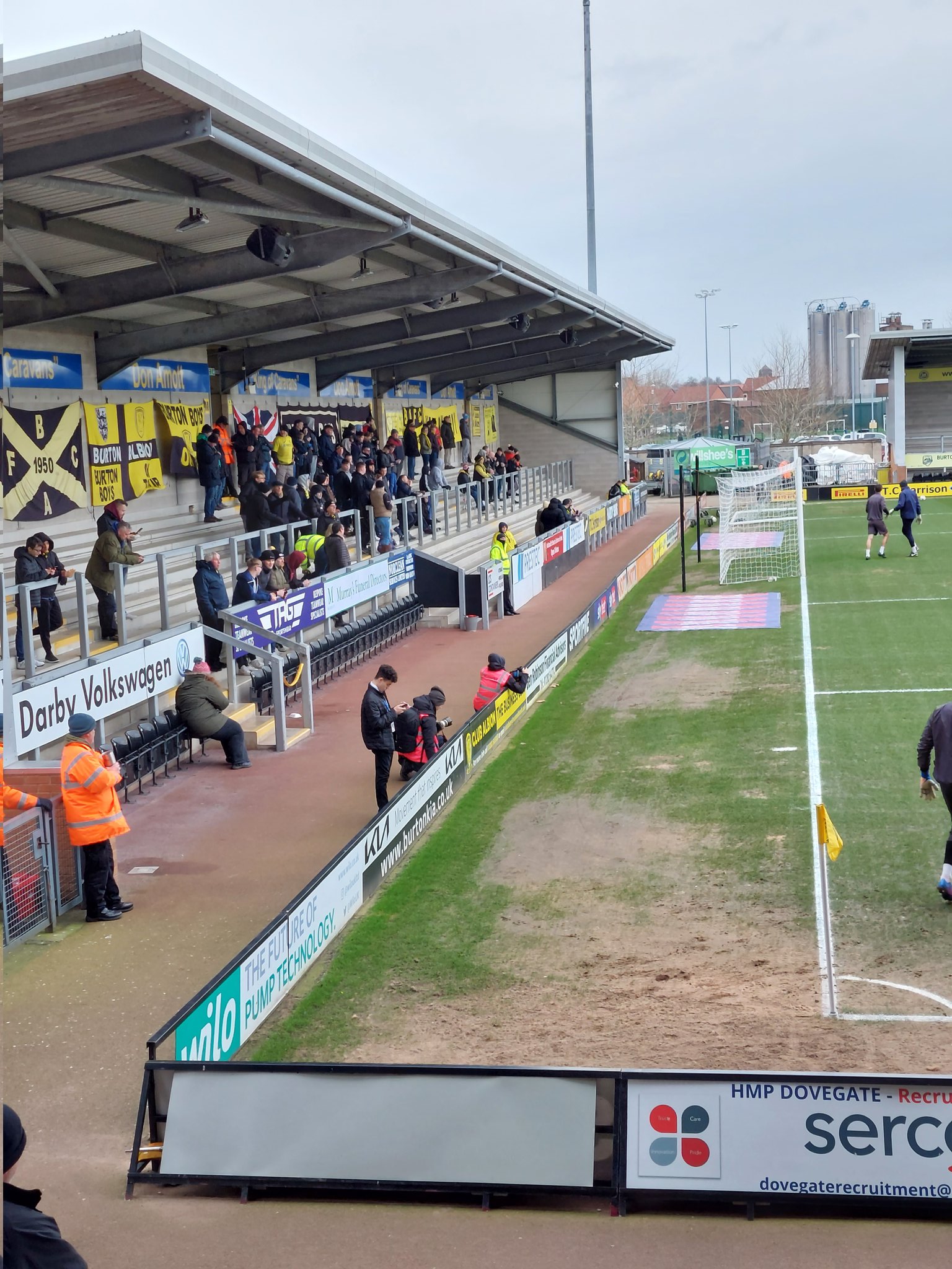 On entering the ground it’s apparent it’s a very small one for this level. Considering we’re in the same league as Sunderland (49,000 capacity), Sheffield Wednesday (39,000 capacity), Ipswich Town (30,000) etc. Burton is smaller and has worse facilities than Kidderminster Harriers who are three tiers below them. That said, the ground is charming, and it looked full considering there were only 2,500 people there. It’s definitely in my ‘sweet spot’ for attendances.
