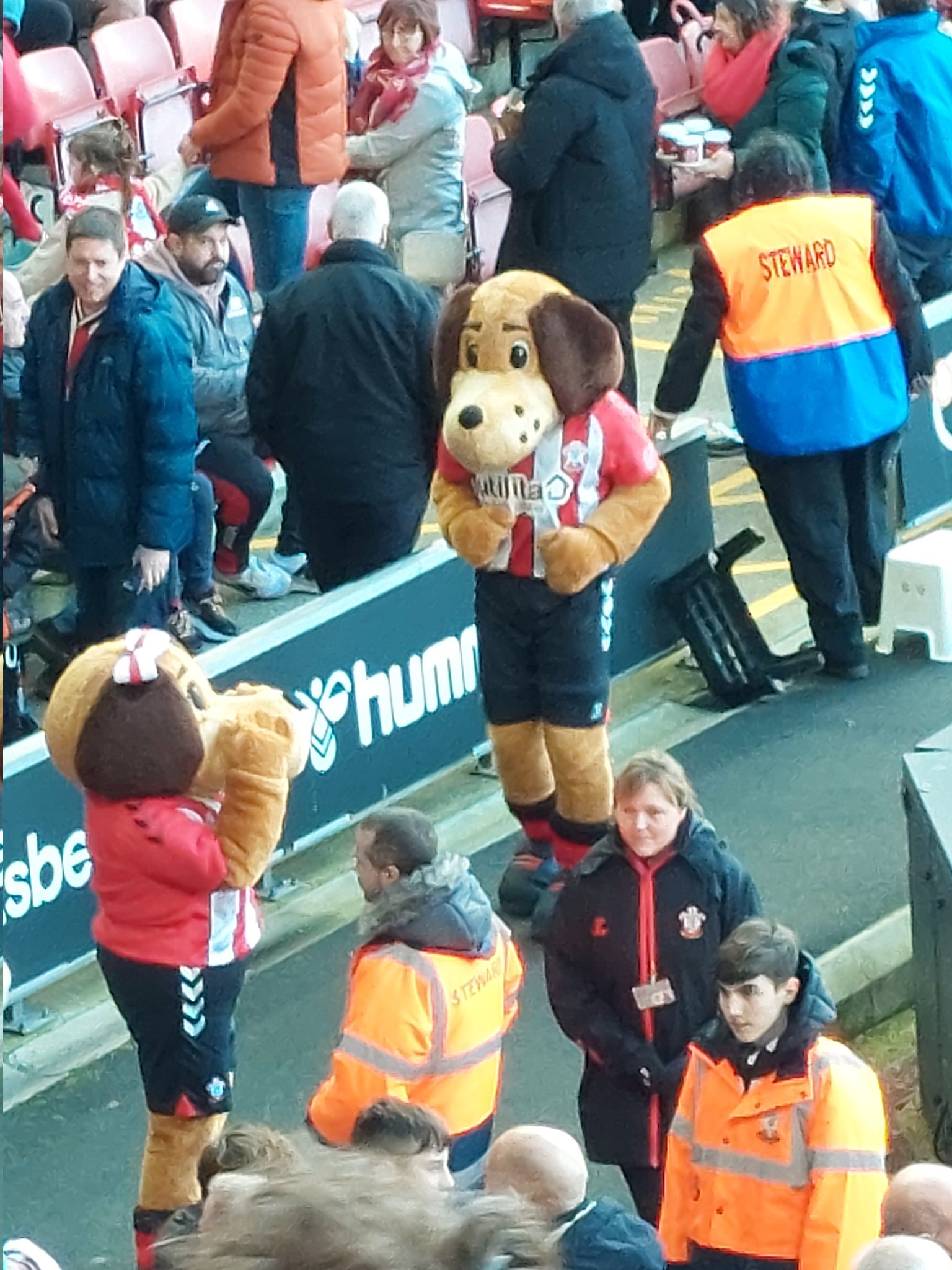 On mascot watch we have Sammy Saint. Sammy is a prankster. I watched him and his whole aim in life is practical jokes and then giggling to himself. It had a certain charm to it. He’s got a sister/wife/girlfriend as well but I have no idea what her name is. I can tell she’s a girl though by the dramatic bow on her head. Look at her giggling away. They must be related.
