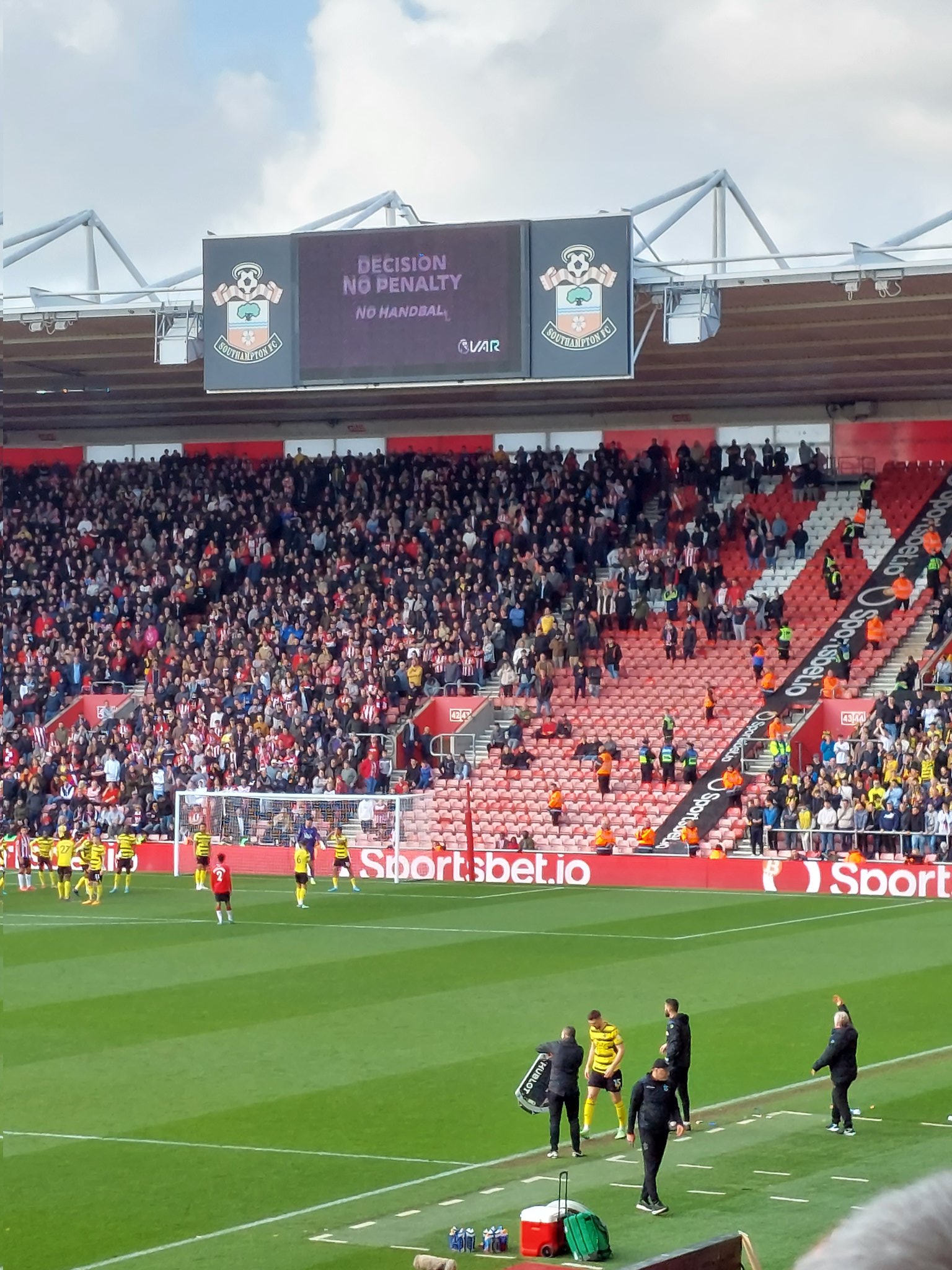 Half time was the best part of the day. Mixmaster Ed, the Southampton DJ, played a load of relegation themed songs to irritate their visitors including “Down” and “Free Fallin”. There were also messages for people’s birthdays and whatnot and one of those was “Happy 70th Birthday to Grandad Fat Boy”. Grandad Fat Boy! As if that got read out. The second half was a frustrating watch. Watford players cheated extensively. Normally by falling over and pretending to be injured to stop the game but then refusing physio treatment so they could stay on. They were very persistent at this. It’s a form of gamesmanship that some people (Simeone for example) think is an acceptable tactic. I believe it to be total scumbaggery from teams who can’t win without cheating. The only other thing that happened of note was a VAR check on a blatant handball, which I could see in real time. No handball says the VAR. It didn’t even make Sky’s highlight package.