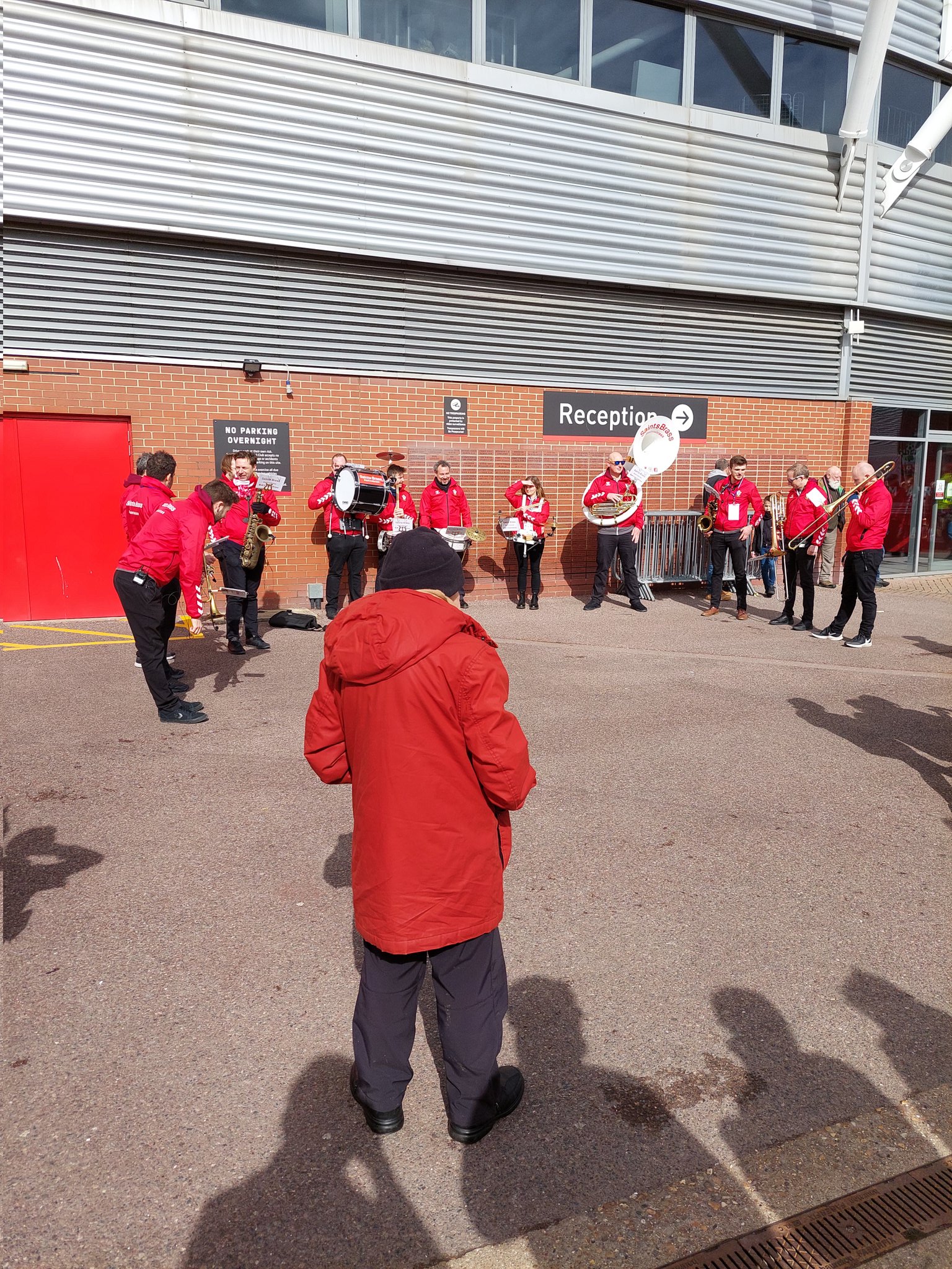 We also walked past these lads. They’re quite famous at Southampton, it’s the brass band that plays “When the Saints Go Marching In” before the match starts. It’s quite the sight, seeing a brass band march down the side of the pitch. It certainly gets the crowd fired up. This is them warming up. They’d just finished their rendition of “Smells Like Teen Spirit” by Nirvana. Not quite what I was expecting.