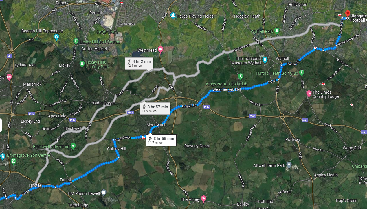 On leaving the countryside I find myself in Wythall, which is a posh place with golf courses, rugby clubs and farm shops. I’m glad I don’t need to urinate in Wythall as the locals would almost certainly consider this a faux pas. I head out of Wythall on Tilehouse Lane and the ground is getting closer. I can hear football noises. I can also feel brambles tearing at my flesh as I accidentally stumbled off the path. A right turn just before Whitlocks End and I’m there. I have made it to the ground. 11.7 miles. Conquered.
