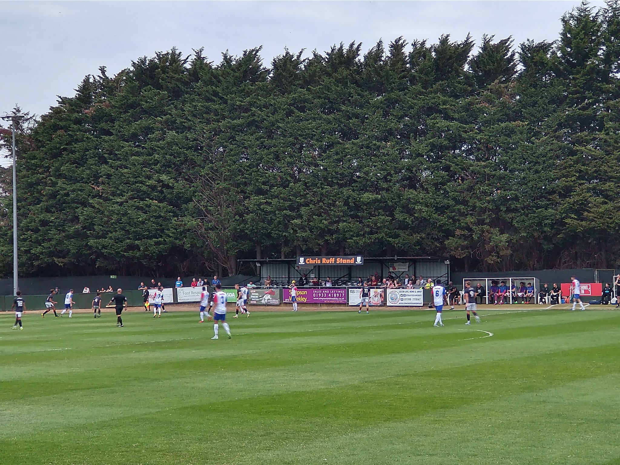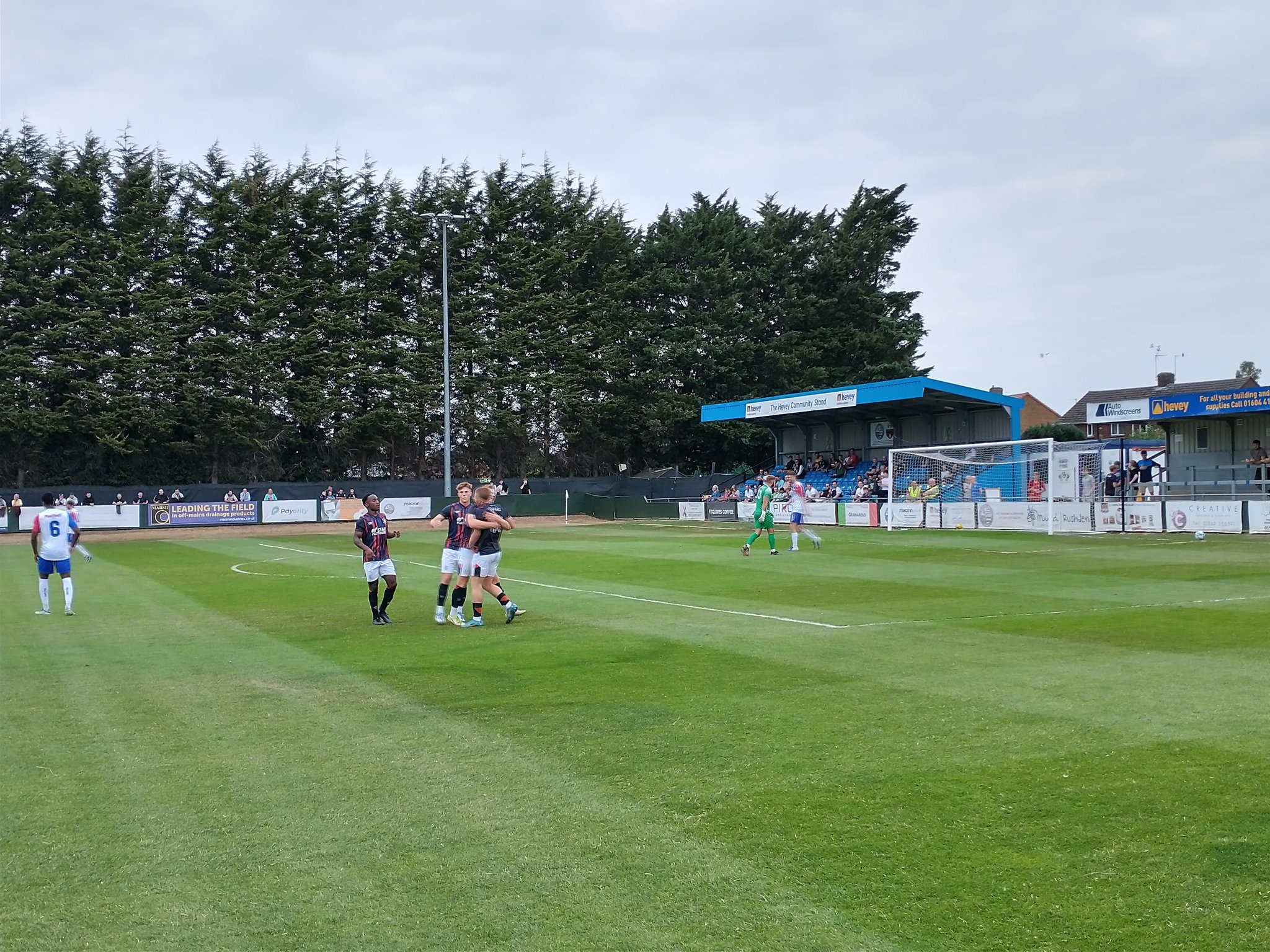 Hayden Road is a tiny ground, boxed in by residential housing and on one side by an enormous hedge made entirely of tall trees. Normally this is the one where I go to my camera roll and pull up a picture of said ground so you can see what it looks like. One small problem…this game was on the night after my pub crawl column about Northampton. So, Mike picked me up from Northampton around 6.15-6.30pm and I was smashed. We then drove over to Rushden for a 7pm kick off. It was a bit touch and go but we made it for around kick off time. Time to take some pictures right?