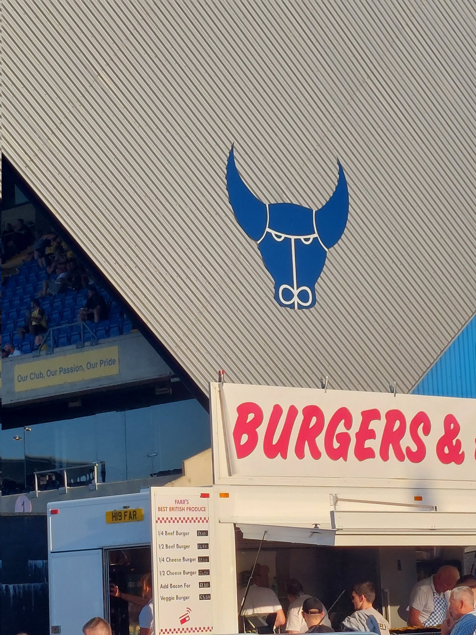 This is the view from the car park. As you can see, the one end of the Kassam is completely open so you can see into the ground from the car park and, vice versa, you can see all of the car park from the Kassam. So, you can keep an eye on your car during the game. The left side there is the away “end” and we passed a fair few Swansea fans on the way in. We turned up at 7.15pm for a 7.45pm kick off, which was probably leaving it a bit late. On our way in the burger van had a massive queue.