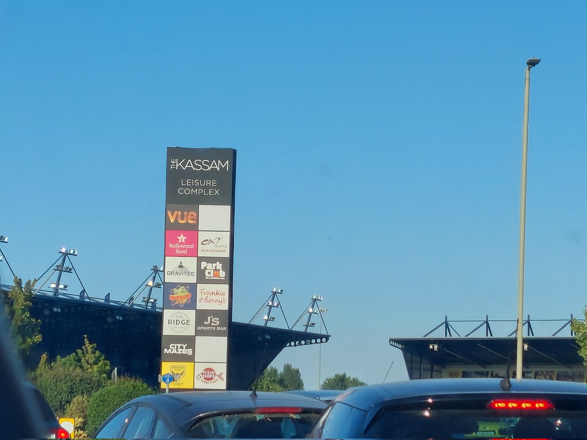 Having walked back to the car in the boiling heat, I started hoping our seats were in the shade tonight. Oxford have decided that it’s easier to just stick a big football on signs rather than write “Kassam Stadium” as football clubs change sponsors on these things all the time. We’ll just give them a ball to follow. Am I now the simpleton? The great minds of Oxford, home of the world’s most famous academic institutions, have deemed me not capable of reading and only following a ball. I mean, they’ve nailed football fans there to be fair. This route is also the one good Ol’ JR takes when he’s in town so they’ve given him a signpost too bah gawd.
