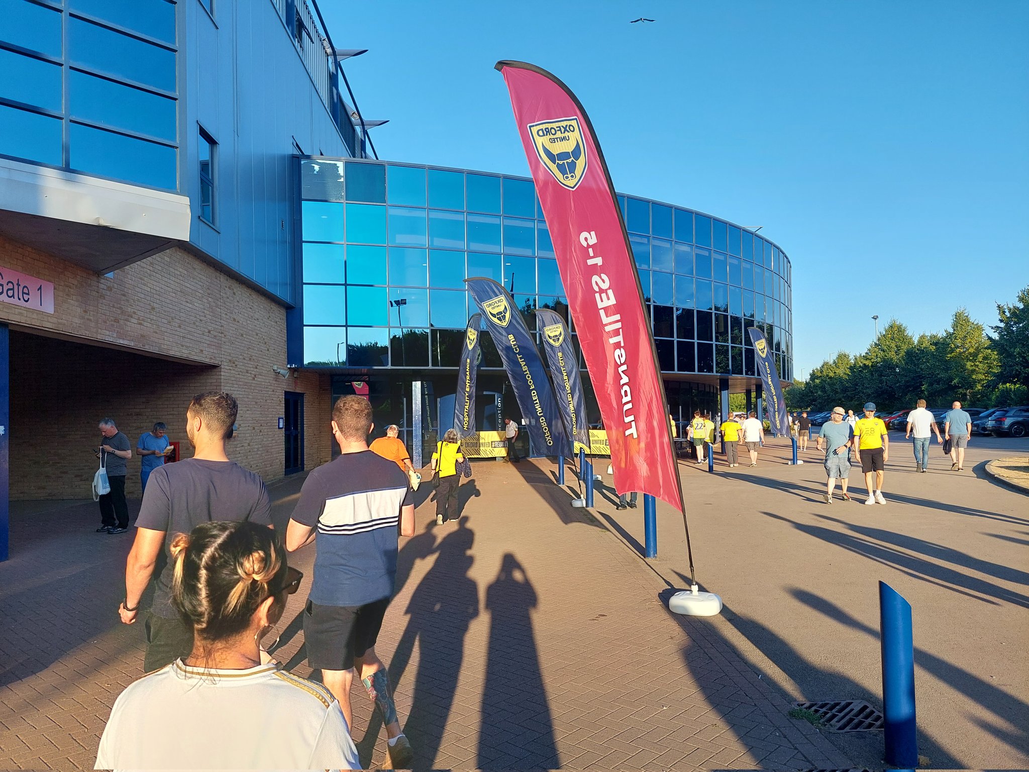 Welcome to Oxford Leisure Park! Home of the Vue Cinema, Hollywood Bowl, Frankie & Benny’s….and somewhere down the bottom there…. Oxford United football club! An afterthought on their own retail park. Marvellous. Only featuring slightly above the chippy. The part of Oxford I’ve been dreading is the car park. It’s deserved too. The car park isn’t well organised. Normally at club’s you’ve got people telling you where to go. This was a bloody free-for-all for people driving around full rows of parked cars trying to find a spot. We ended up parked quite close to the exit with Maria attempting to park on the end of a row that would have literally blocked in half the crowd at first. One of the benefits of having a Toyota Aygo is we parked in a space that wasn’t actually a space. Another benefit is that the parking here is it’s free, hence the lack of organisation. Nobody cares how many cars are in there because it doesn’t effect the bottom line.