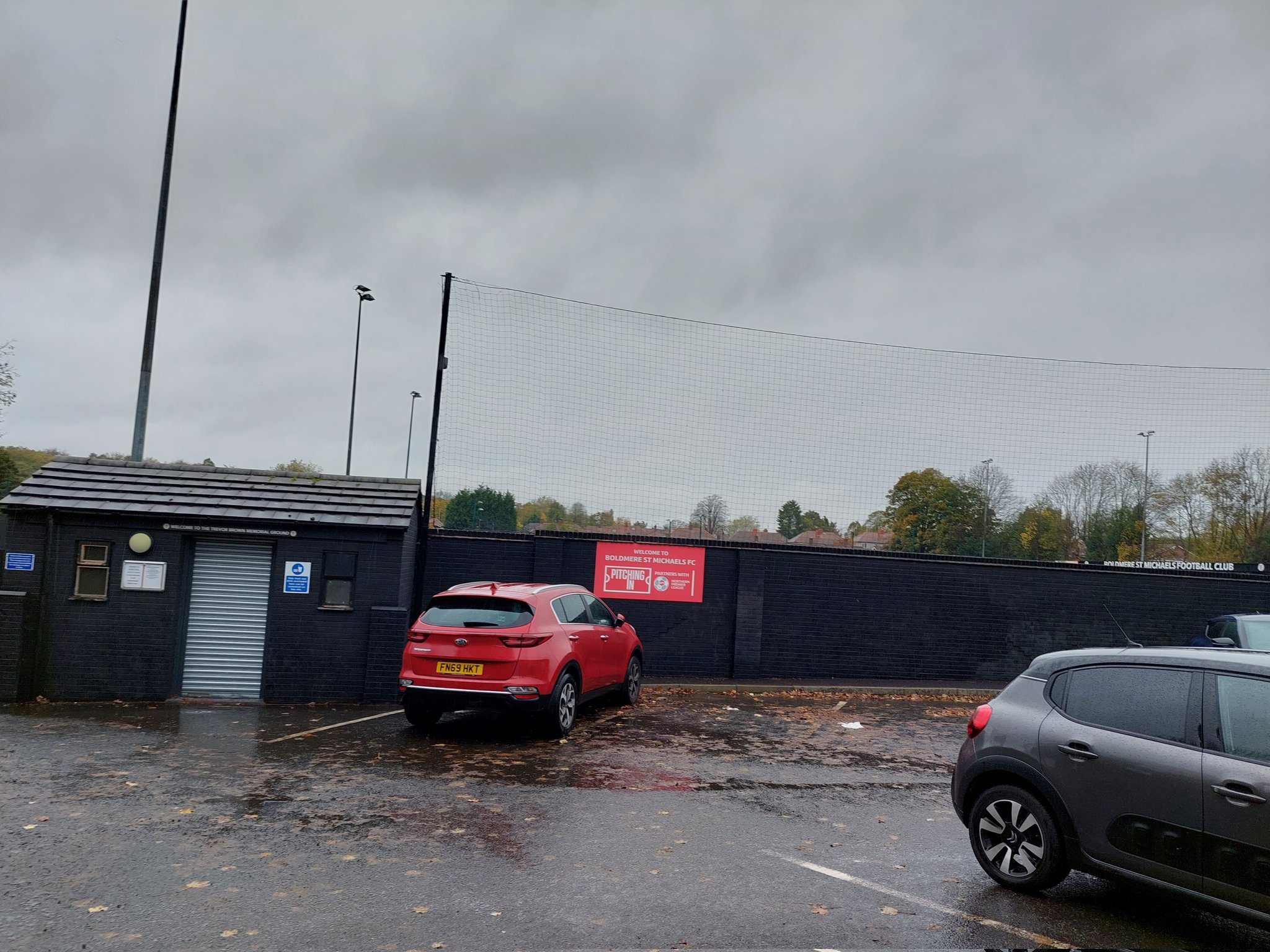 We meet Tom at the pub but he’s too sad today to get mentioned so that’s it for him. At the ground Fylde’s coach is sat ticking over. I hope they didn’t leave the engine on for three hours, that’s just wasteful. I appreciate the nets by the wall here, so any errant clearances are captured and don’t hit the cars. The nets aren’t that high! We walked past the St Michaels church to get to the ground, and I’m amused that the reverend is one “Simon Cocks”. Not Cox, mind you, Cocks. You see a lot of Cocks around the church. Strange that it’s not Catholic.
