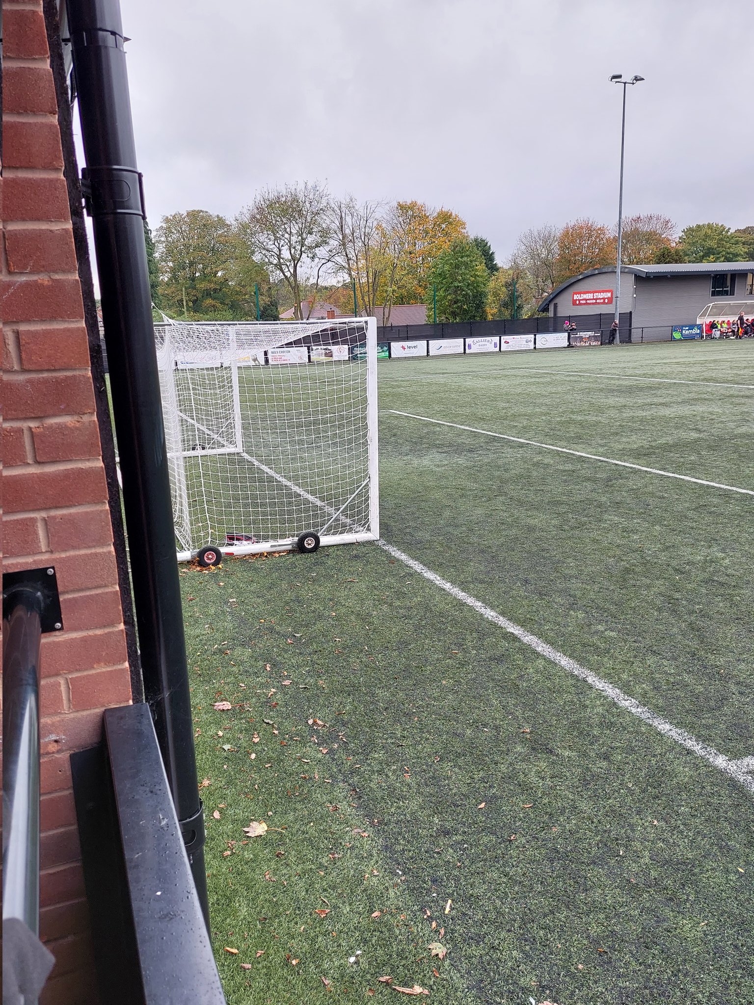 Some observations on the ground. The clubhouse entrance is into a covered area, where we stood first half. Along the side is the main stand; the Harry Peakman Stand. It’s a nice little stand with three rows of seats. We’d get a close up look at that later. I like the trees in the background and there’s a little alleyway behind the stand for balls to get lost in. Just off to the right of this shot is a bunch of tables so you can bring food and drinks out and sit around a table to watch the game if you get there early enough! Unfortunately, this area is not covered so it was too wet for that today. Boldmere will ultimately lose points for having a plastic pitch and a goal on wheels but apart from this it was a tidy little ground. Boldmere should have a second goal when a frankly ridiculous effort from 40 yards hits the post and bar before being claimed on the line by the Fylde keeper.