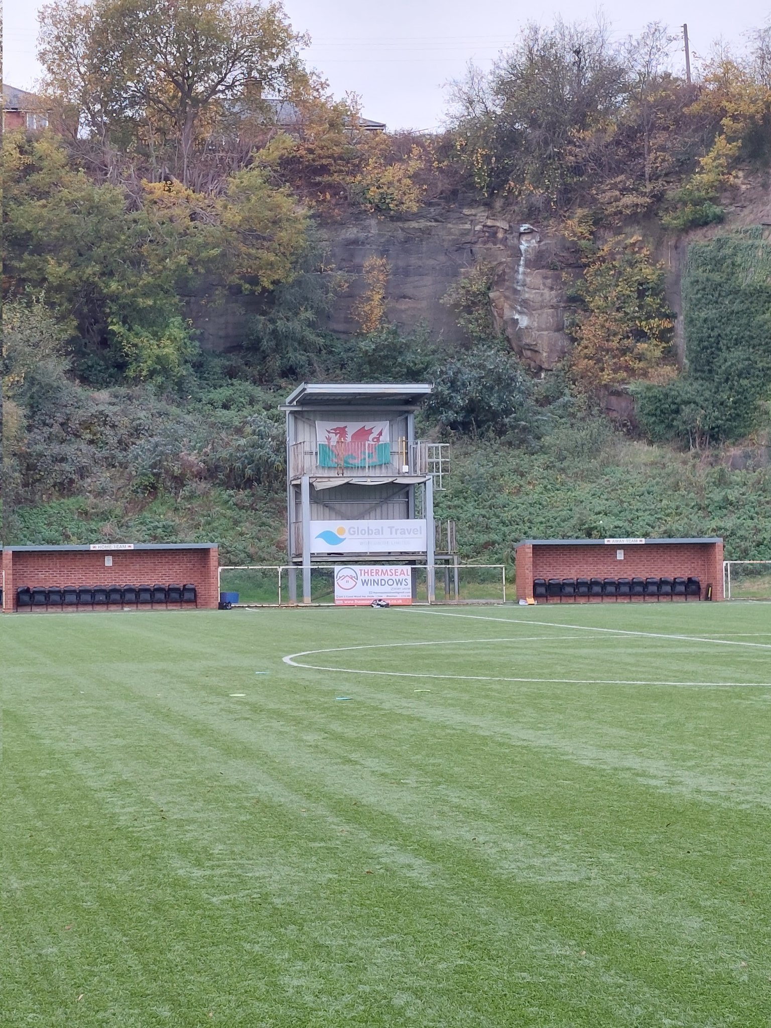 It’s a tidy set up with one main stand and standing areas all around the rest of the ground. Opposite the stand is the dug outs and a little TV gantry with a Welsh flag inside it. No cameras today so if we miss a goal, it’s gone forever. The pitch is plastic unfortunately but given the weather in this part of the world it’s not a shock. The goals aren’t on wheels though, so that’s a bonus point. It also has less aggressively shit fencing compared to English non-league teams who’ve opted for astro.