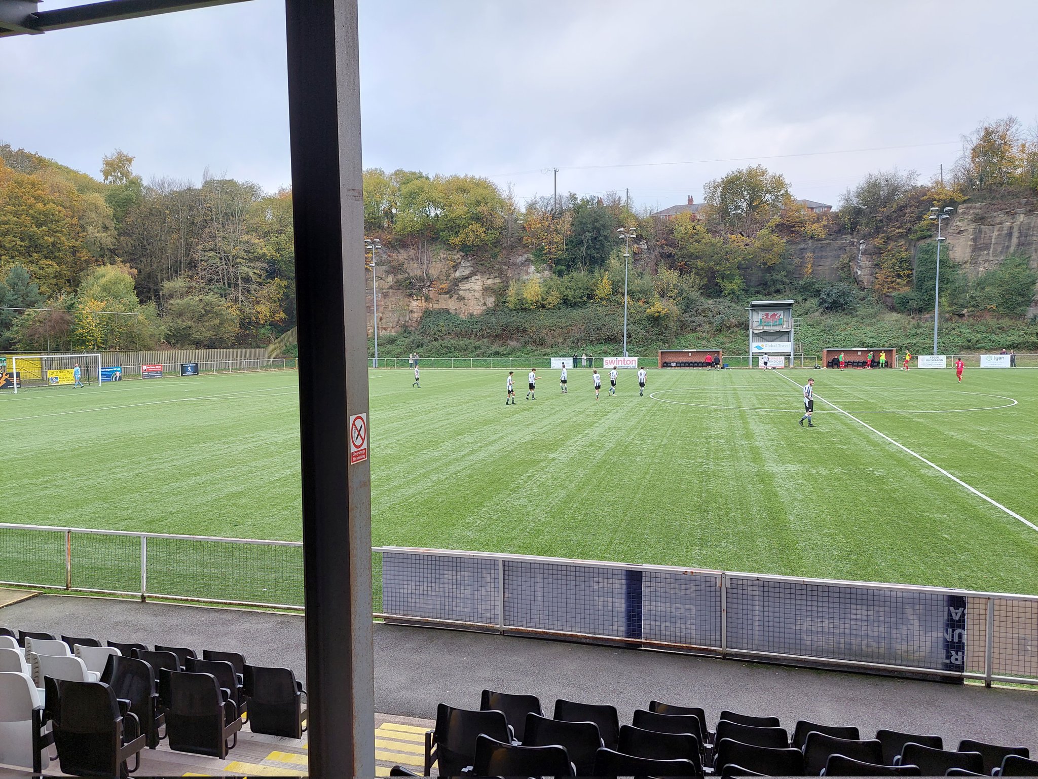 This is the famous Rock. There’s housing running along the top there and I reckon people could probably stand in their gardens and get a cracking overview of a game. Like the top tier at Wembley. There’s a weird amount of flies in the air down in this corner. I find a pile of dung behind the stand later in the day that explains this situation but it’s very weird seeing flies in mid-November.