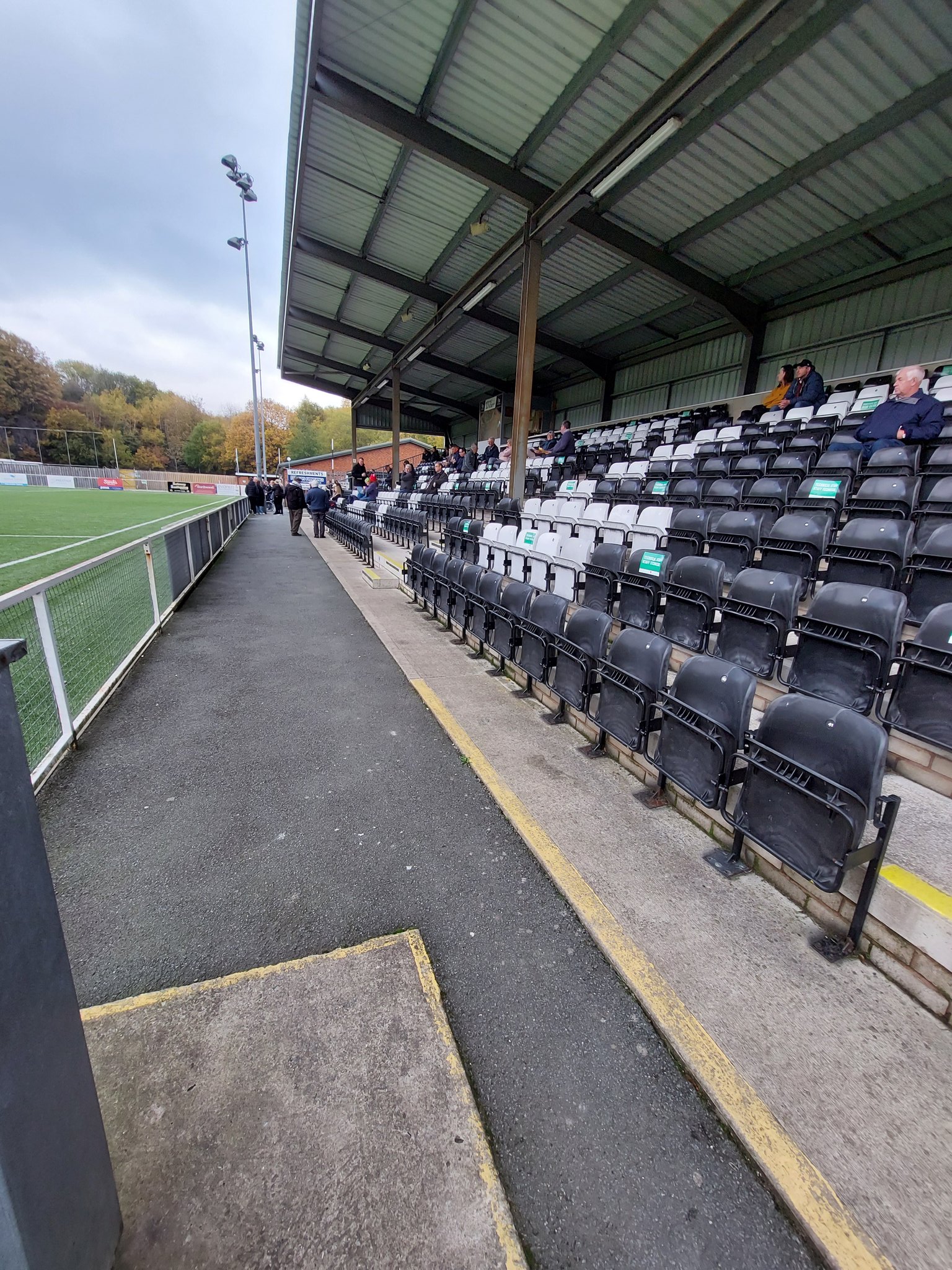 This is the main (well, only) stand at Cefn. We sat at the far end to eat food and then moved up higher in the second half. It’s an open ground so you can move around and explore at will. The vast majority of people opted to sit in this stand, and it was a good view. The little green signs are a leftover from COVID and are where certain people were supposed to sit during socially distanced games. Maria was sat in a seat that had PRESS on it in the second half.