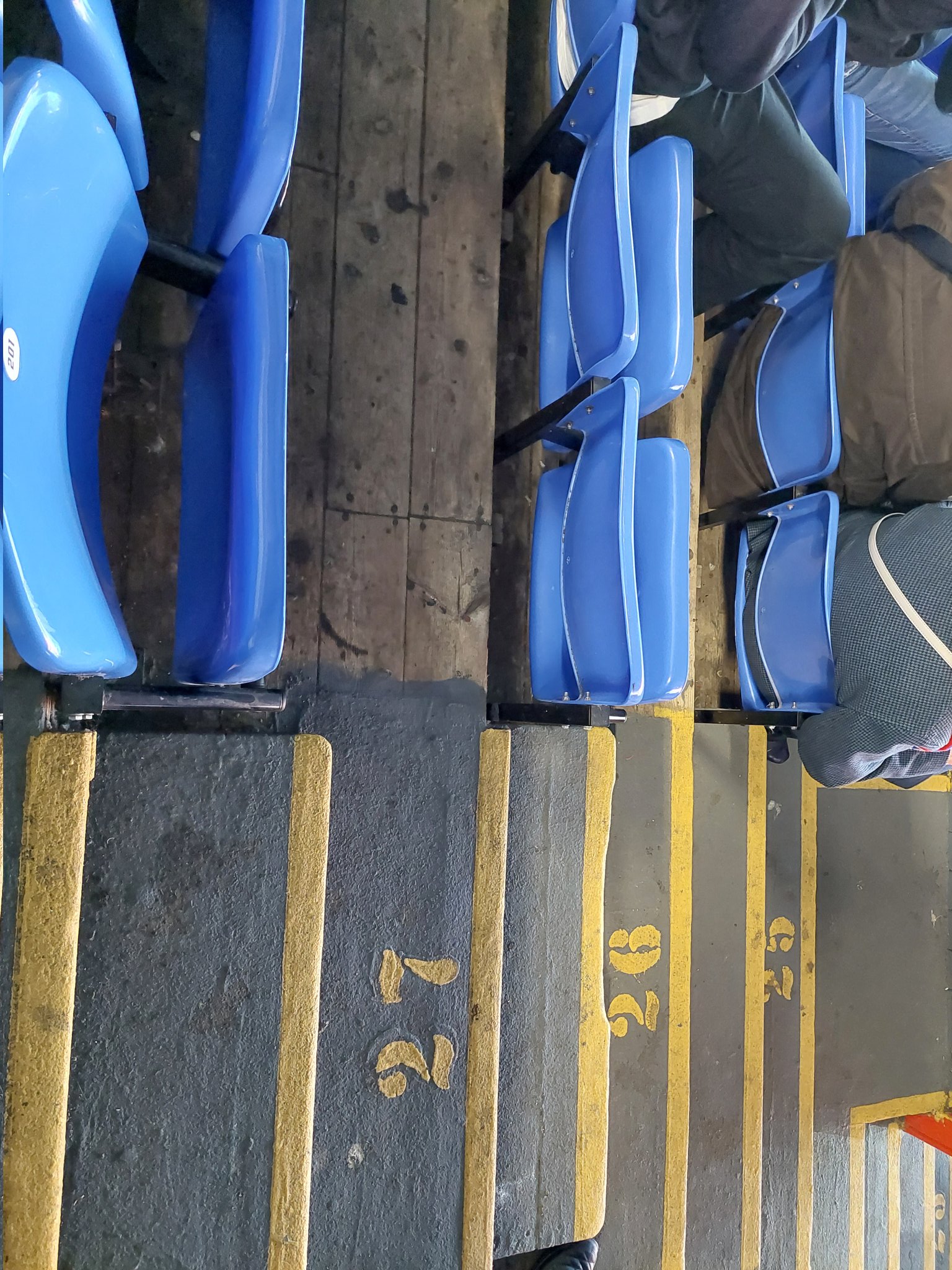 Here are the steps, seats and wooden boards. Not much legroom here and I was grateful to be sat at the top of the steps so I could stretch my legs out. Half time music included “London Calling” by the Clash. Is there a London club that doesn’t use this? I reckon Fulham should have dibs as they literally “live by the river”.