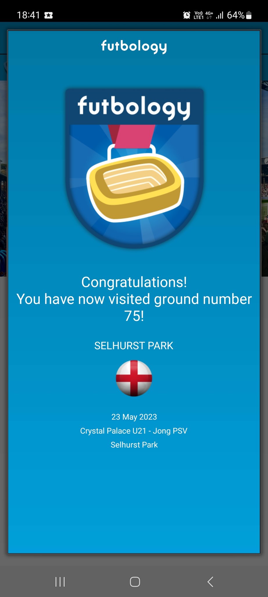 I check in on Futbology and get this badge! That’s 75 grounds done. Selhurst represents ground #42 on my attempt to complete the 92. According to mileage on FootballGroundMap.com I’ve done over 21,000 miles in pursuit of the beautiful game. Considering I’m a relative rookie to this (as detailed in 75 other columns, gentle reader) those are decent numbers.