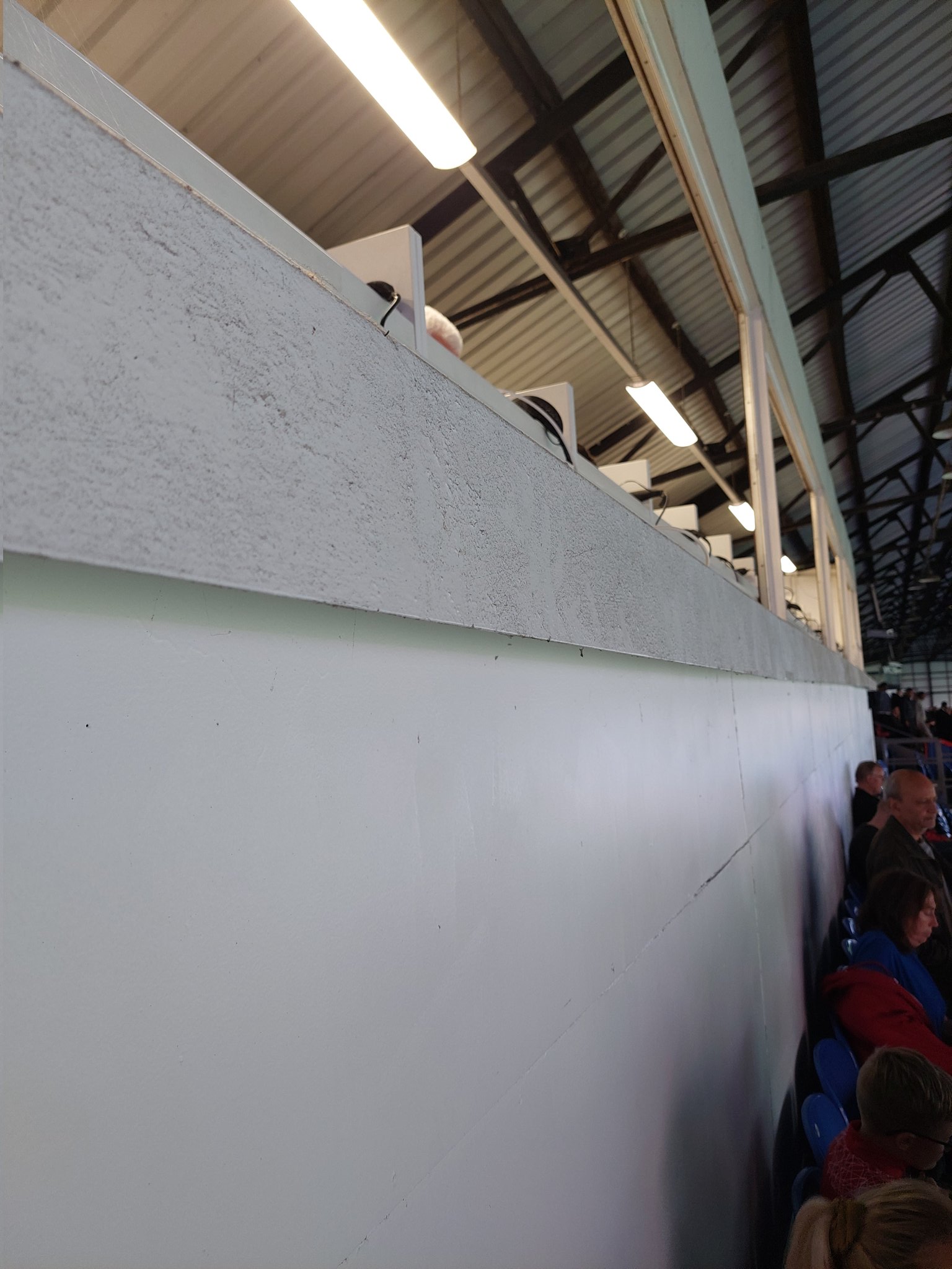 Behind us is this big white wall and on top of that is the area for commentators and reporters to sit. I can’t see into it but this little shock of white hair suggests a veteran reporter was at this game. I bet Kammy a nightmare being heard at games here. Half time allows me to look around myself and get a few snaps. There’s a big “no smoking” sign on the pillar that’s closest to us. As with Luton there are prominent examples of wood in the stand. We don’t want another Bradford.