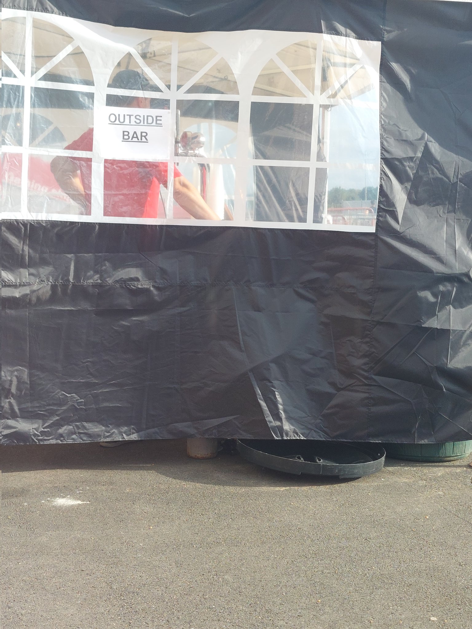 Here is the main stand. It’s cosy and only covers about a quarter of the pitch down that side, but it’s better than nothing. The rails indicate where the players exit the dressing rooms, which are in the back of the building that houses the bar. I’m thrilled, standing here, to discover 1. we have a grass pitch and 2. that little tent is an outdoor bar.