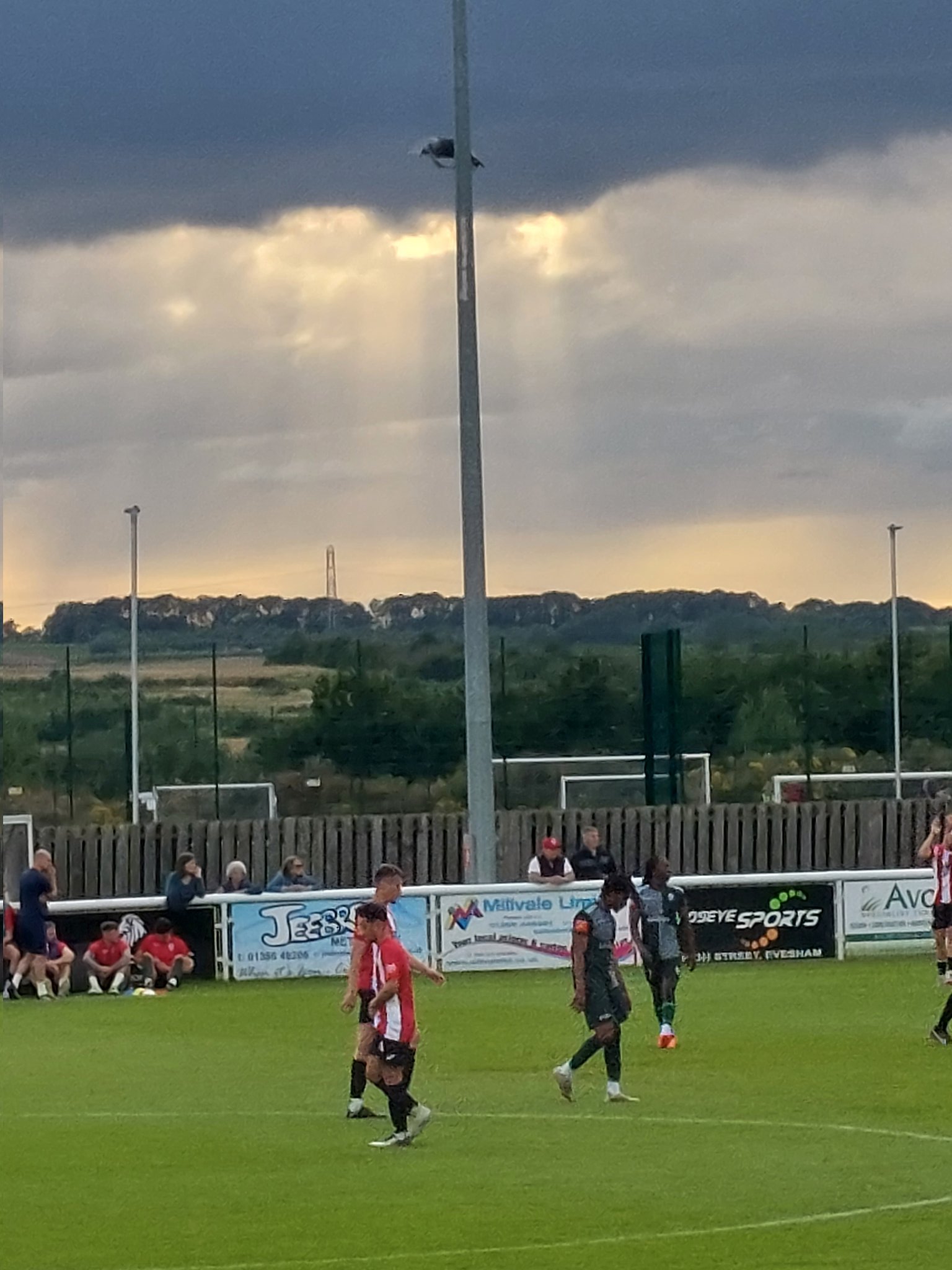 The weather gets a bit dramatic as it starts raining but you can see the rays of light shining through the clouds behind the game. It looks like God has turned up to cheer on the Sporting. They’ll need the help! It gets to half-time. 1-0 Evesham. Sporting have been crap.