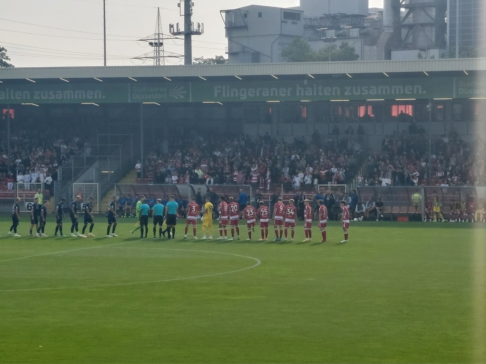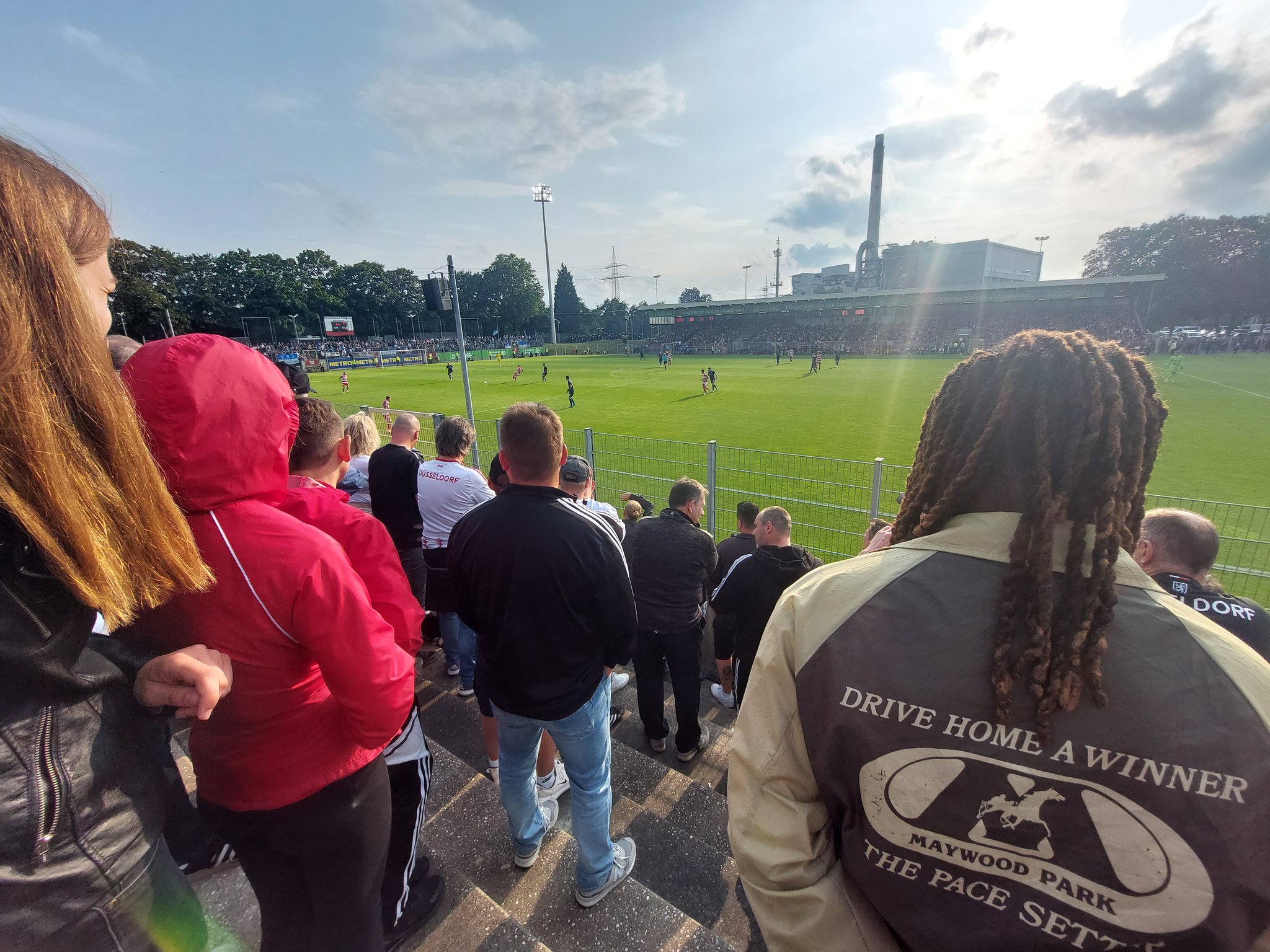 You can see “Flingeraner halten zusammen” on the back of the stand, which means “Flingerans stick together”. Flinger again referencing the street the stadium is on. The game starts and both teams have immediate joy. It’s Dusseldorf who take the lead, on 8 minutes, when a cross is missed by one forward and turned in by another, also unmarked, behind him. It’s Emmanuel Iyoha who finds the net. 1-0 to the hosts.