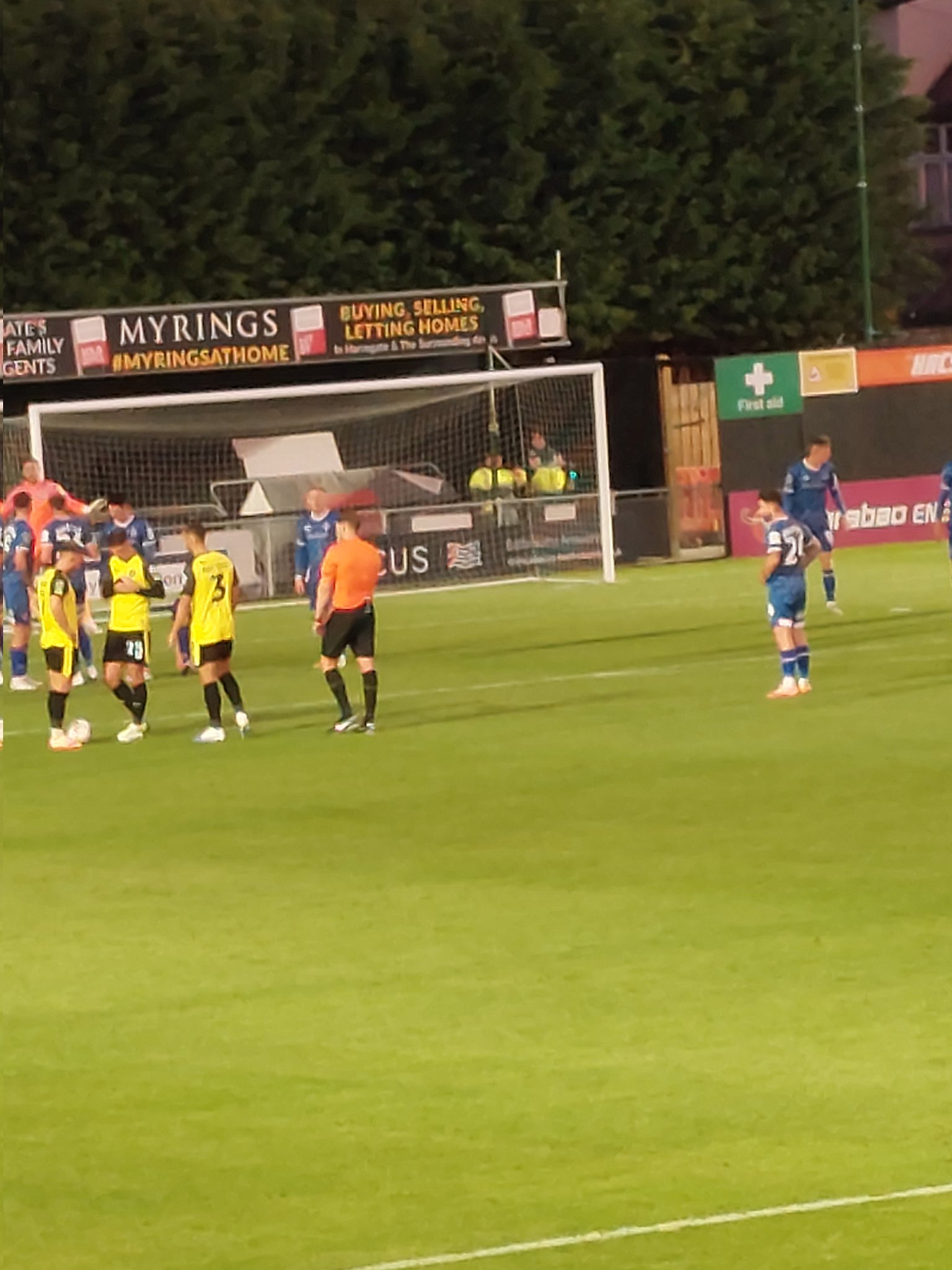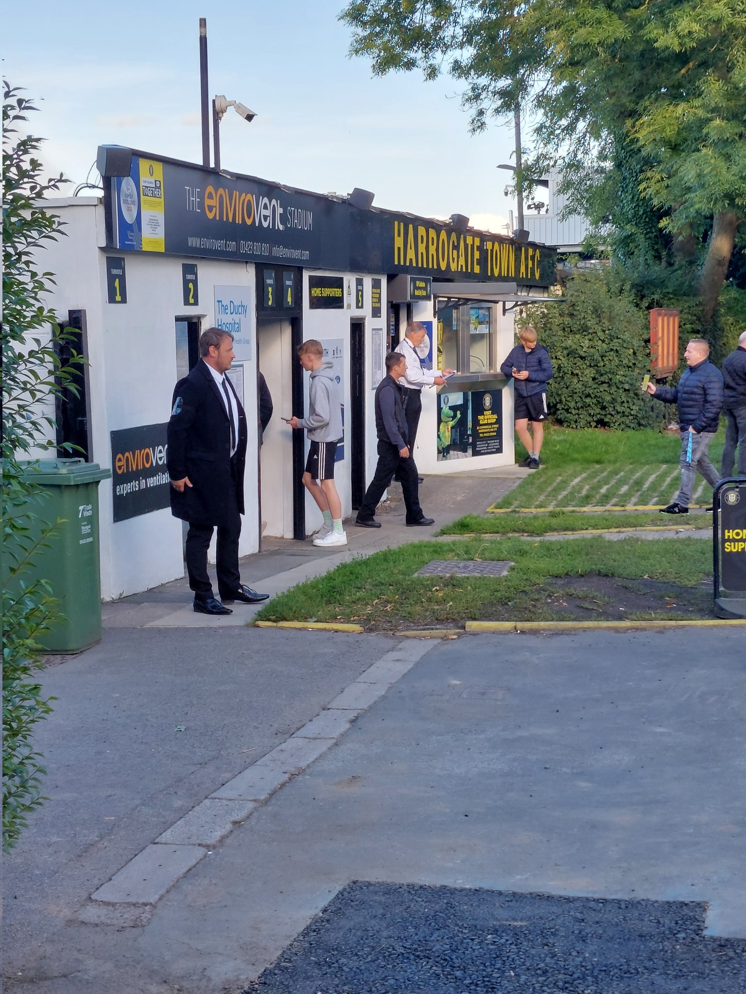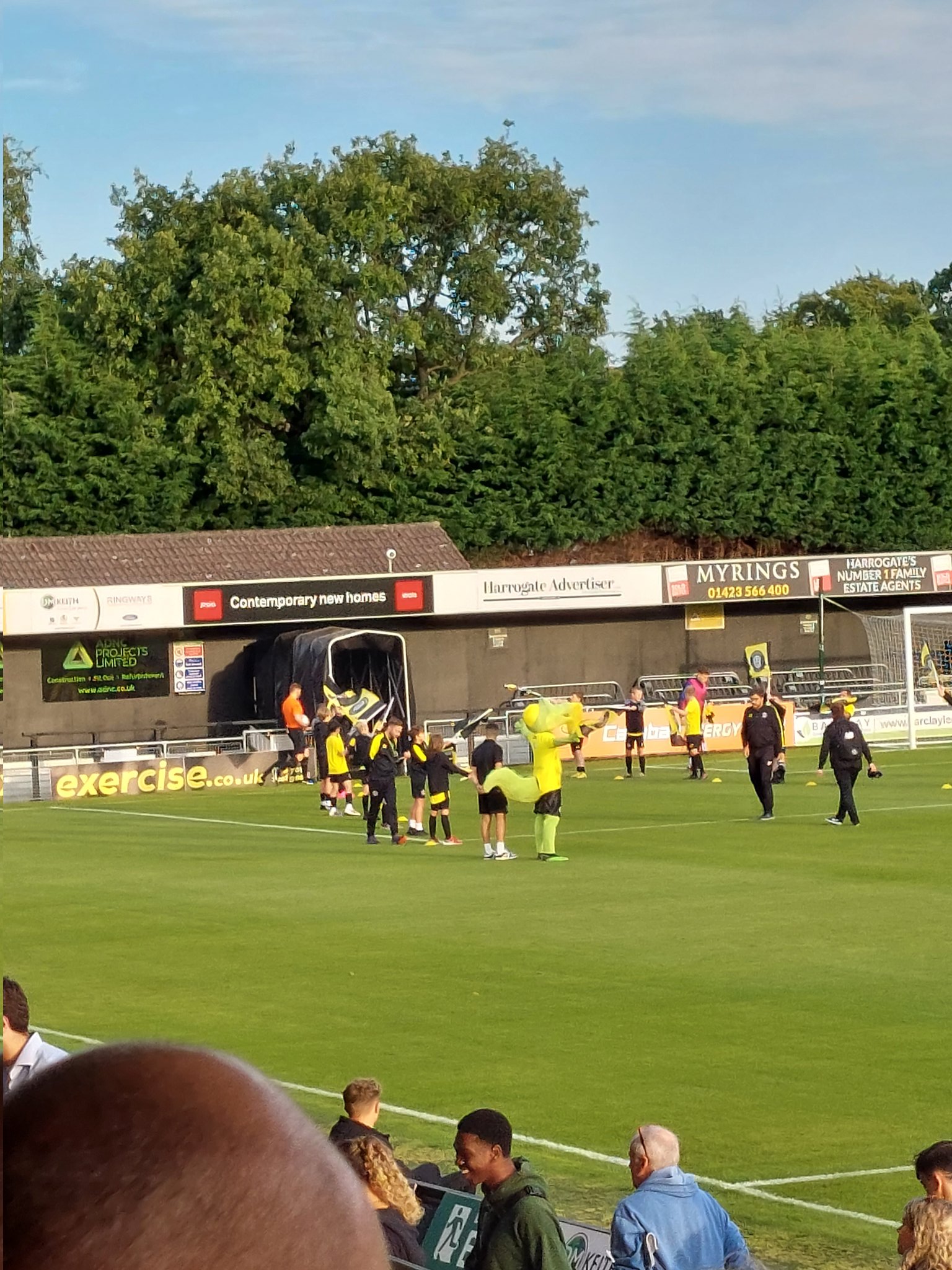 From this picture you can see how semi-developed the ground is. That whopping great big stand opposite us is clearly the best developed part of the ground. The part that feels like it belongs to a league team. We’re sat in there tonight. The rest of the ground is mainly standing, although there is a seated area right down the bottom to the right of us here. You’ll also notice a lad in a Harrogate shirt. I was impressed at how many shirts were on show and the town has a nice sense of pride in its club. There is a Harrogate Town AFC shop in Harrogate but unfortunately it was closed on Wednesday when we walked past it.