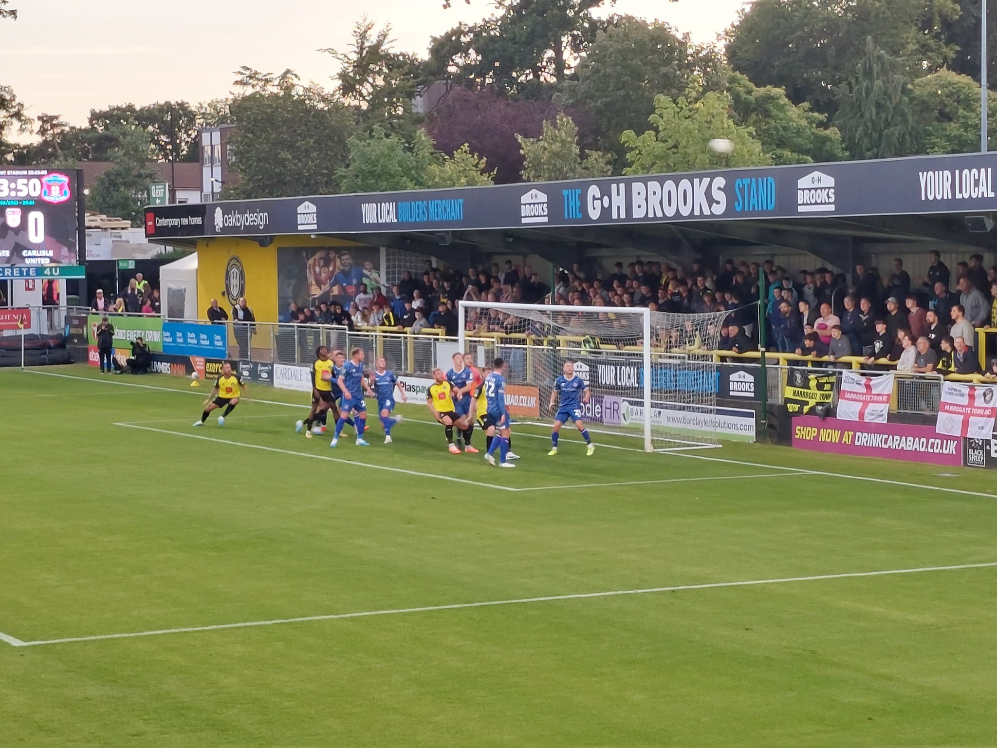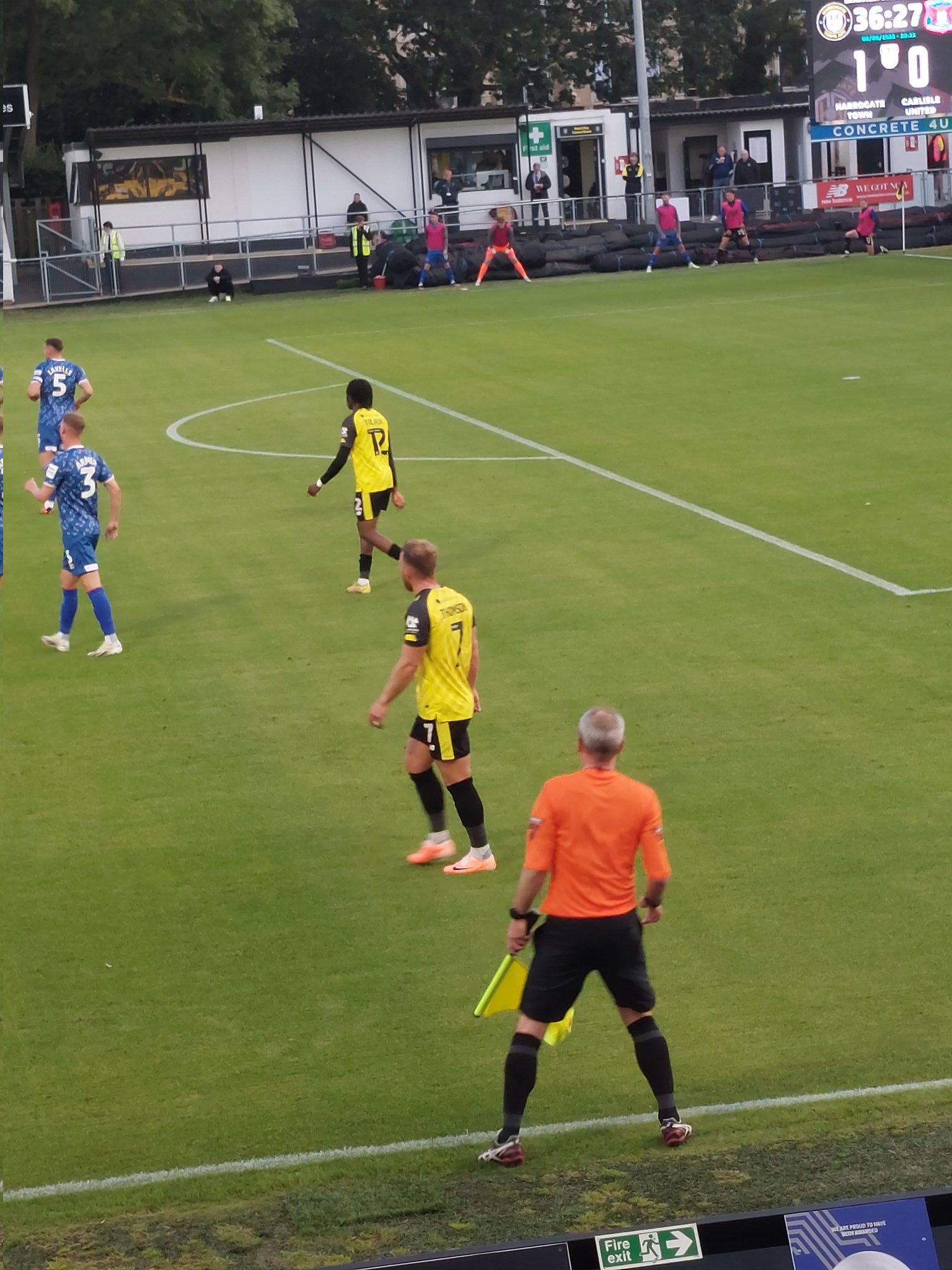 Harrogate get better as the half progresses and should extend their lead. Despite this they give the ball away on the edge of their own D and almost concede. Carlisle make four subs at half time, clearly not happy with how the first 45 went. The second half kicks off and it goes back to being a scrappy mess. It’s interesting to see people walking around with Leeds merch on. Harrogate is very close to Leeds and it’s pretty clear Leeds fans come from this area. Much like Bromsgrove is awash with Villa supporters.