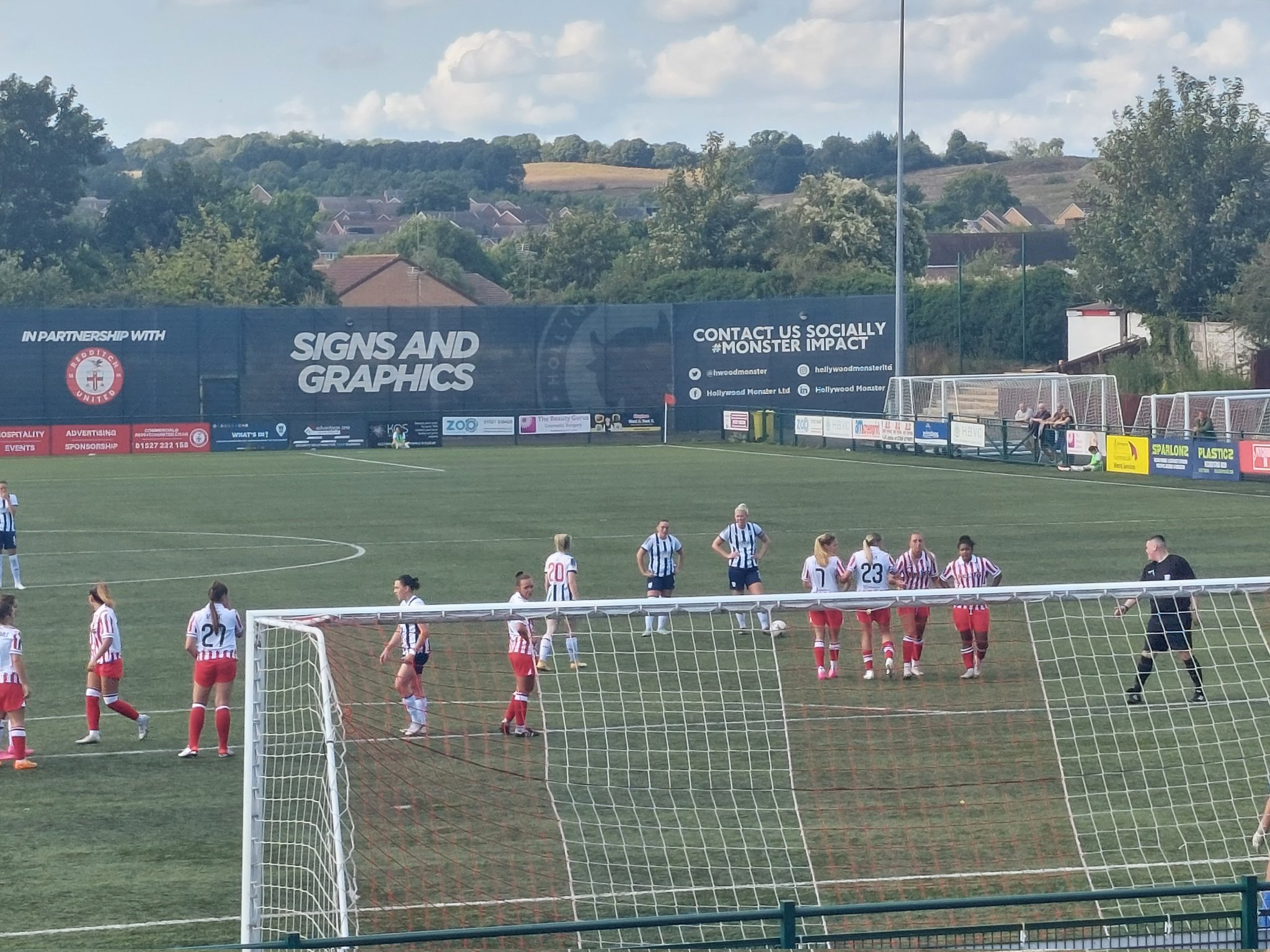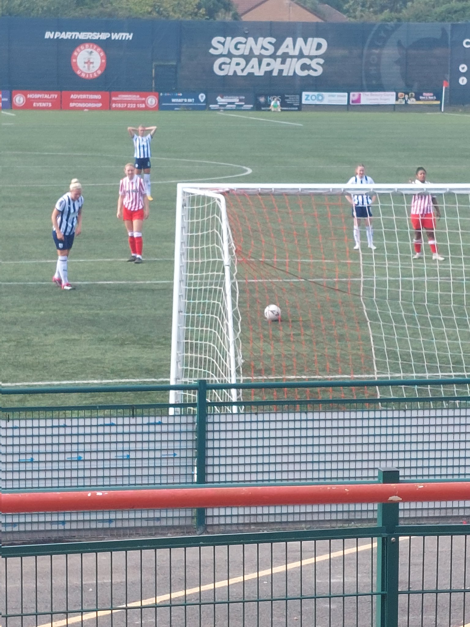 We stand up to avoid the sunlight in the second half, and avoid sunburn, but in our distanced viewpoint we can barely see West Brom make it 3-0. Francesca Orthodoxou turning in a corner from close range. This is about five minutes into the second half and effectively kills the game off. The crowd start pouring out around ten minutes from time. Only around half the crowd remain when Stoke’s #7 (Logan) rounds the keeper and rolls the ball into an empty net for a consolation. The final whistle blows right afterwards and we’re out of here.