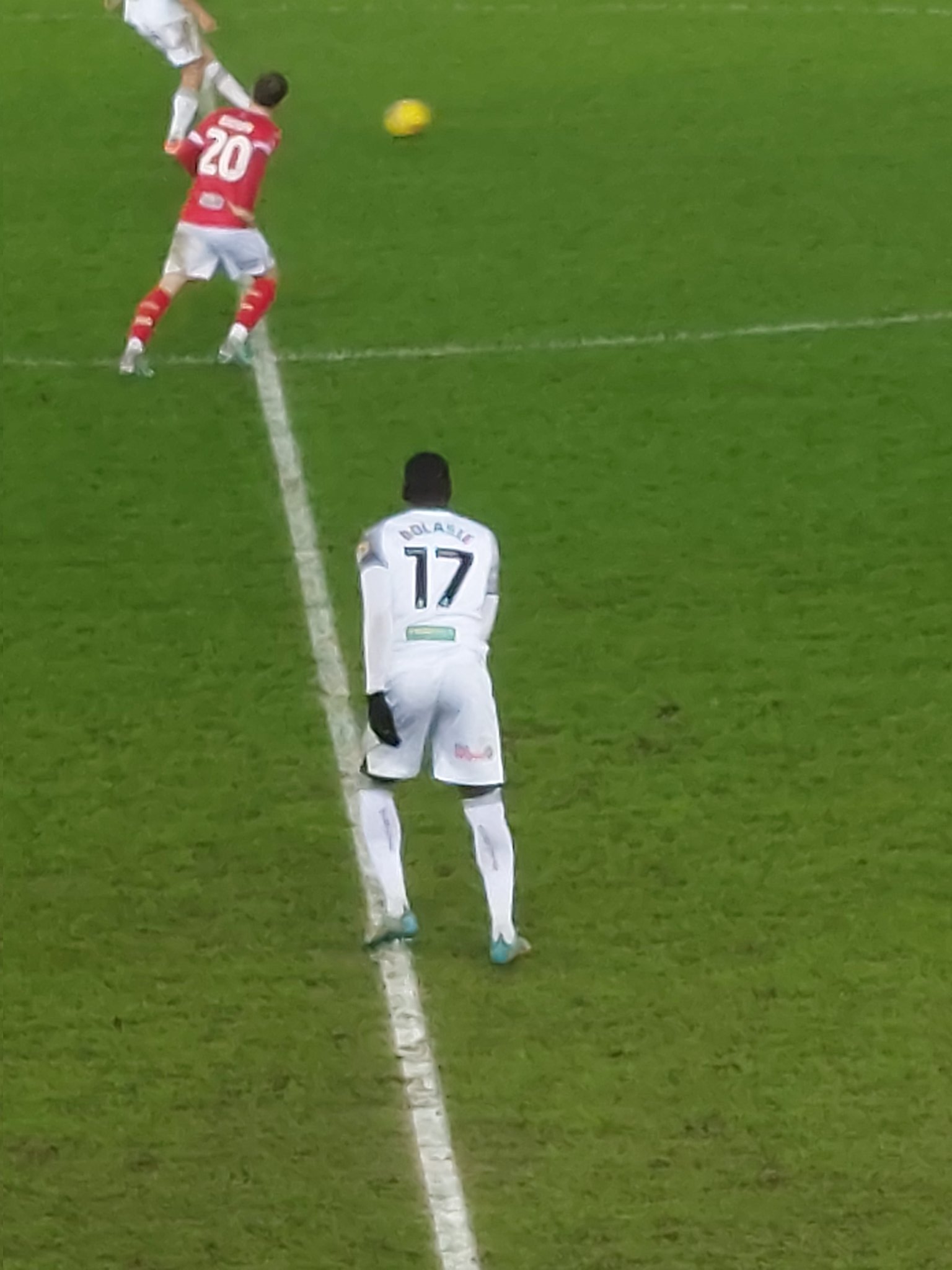 “Bolasie shot from wing, just over. Lad fell up steps and lost his shoe”.