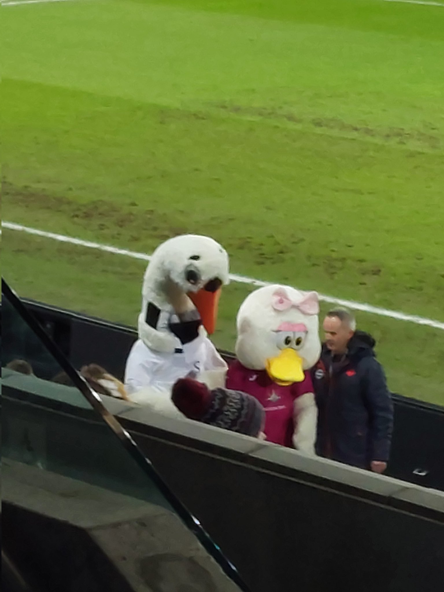 The mascots catch my eye during the warm ups and we’ve got Cyril the Swan, which Bing tells me has “a long neck, wild eyes and wide, flappy wings”. Wikipedia adds that he is a “fictional giant swan”. Cyril, a noted troublemaker, once torn off the head of Millwall mascot Zampa the Lion and kicked it into the crowd. When asked why he did so he replied “don’t fuck with the Swans”. The other character here isn’t the usual ‘sister’ gimmick. Nope, that’s Cyril’s wife Cybil. Who appears to be a duck. Swansea City out here promoting inter-species sex.