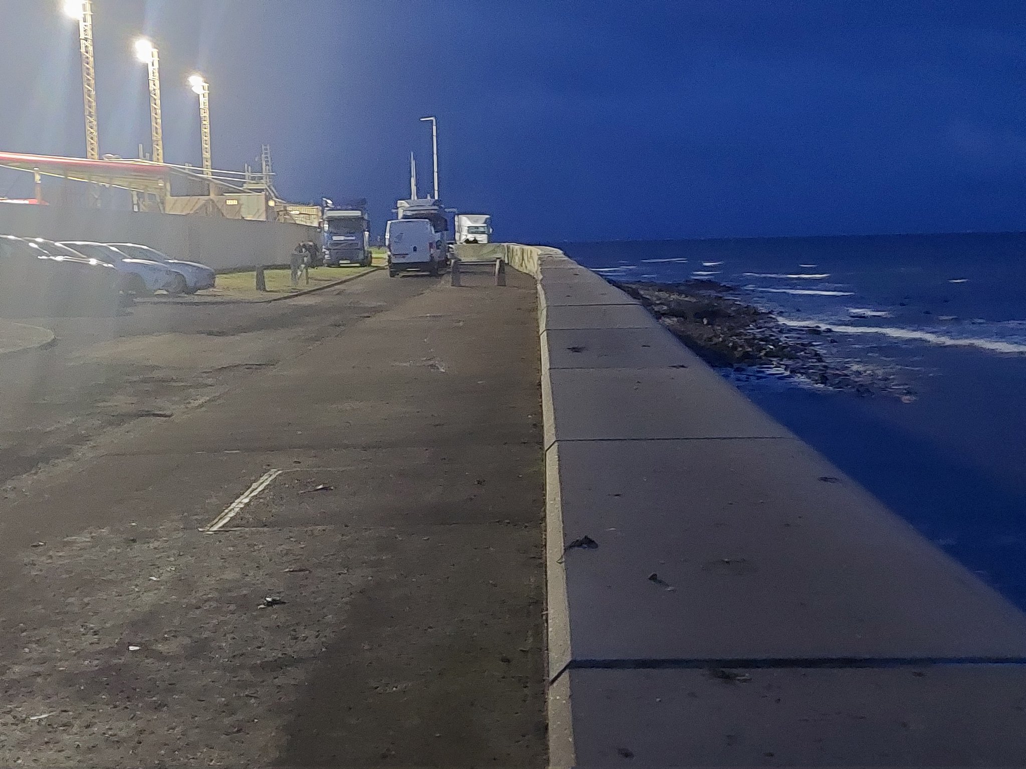 This is a huge game for both teams. Arbroath are rock bottom of the Championship and in extreme danger of relegation. Raith can go top of the league with a draw. Eddie hasn’t been here before but we read up on the parking and his instincts take him behind the stadium past Pleasureland, the neighbouring amusement arcade, and they’re bang on. We park next to the seawall. It’s ideal. Not at least for showcasing, in photographic form, how close we are to the North Sea.