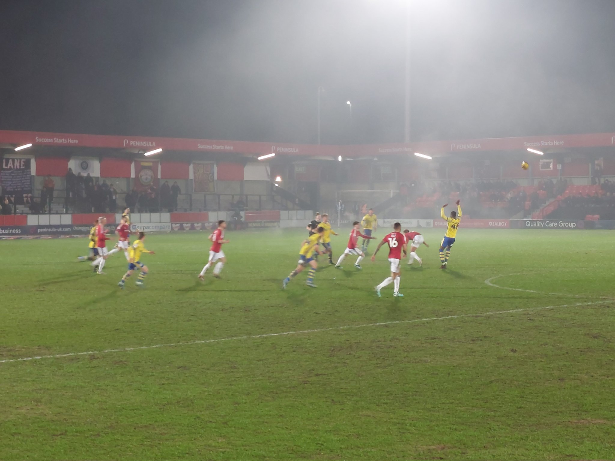 In the second half Salford are much better and should make it 2-0 when Kyrell Malcolm fires over from close range. The fans latch on to Col U striker John Akinde, who told someone to “shat up” earlier and is now getting that banter thrown back at him. He’s subbed off. “SHAT UP”. A big grin from the Col U man as he heads over to Cowley. Out of nothing Colchester equalise. 1-1. 75’ played and suddenly Colchester take over again. Salford outplayed them for half an hour in the second half but they’re holding on at the death for a draw.