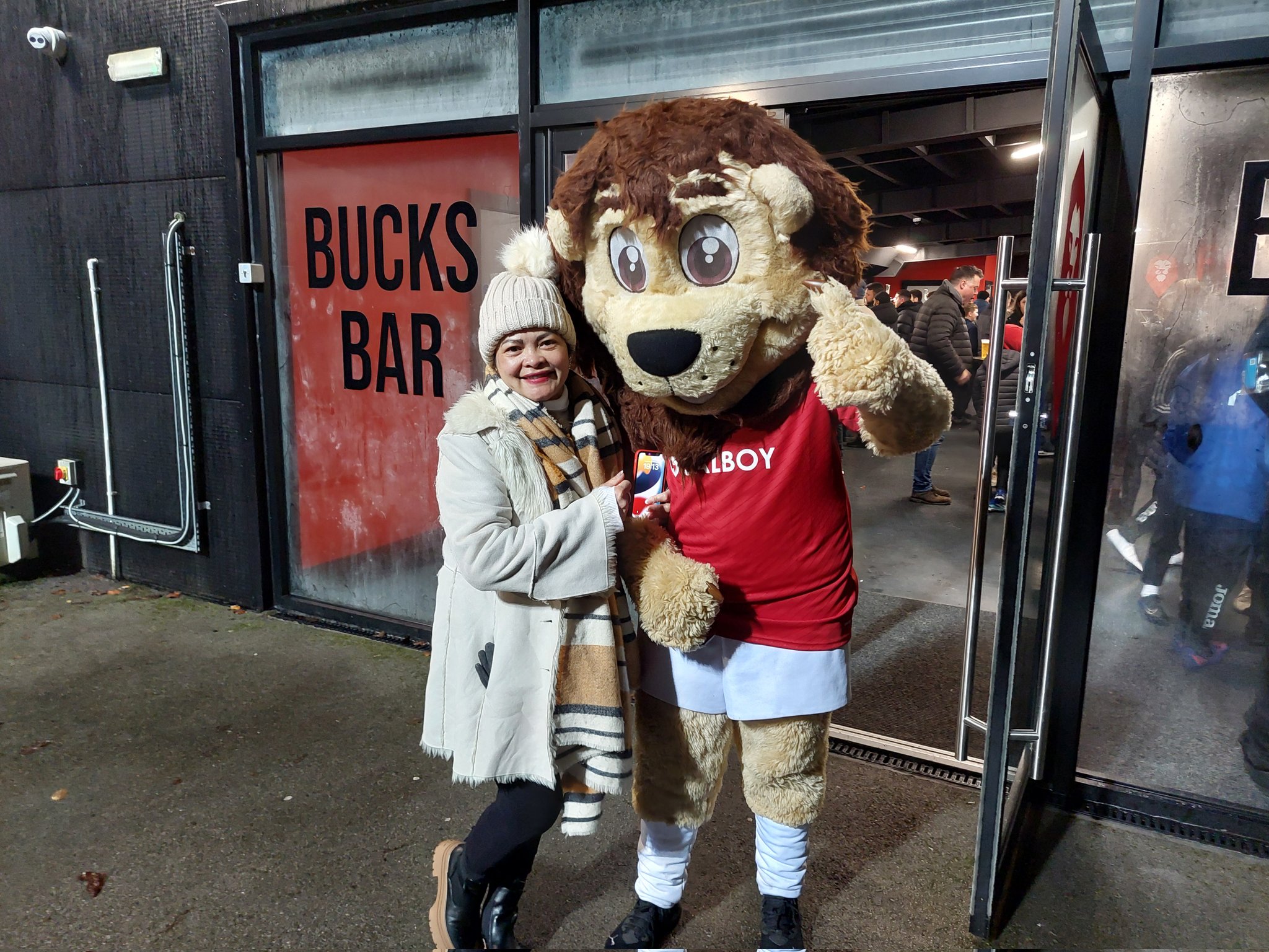 Maria, once again, spots a mascot in the wild and snaps this photo with Billy the Lion. It does also allow me to show you Bucks Bar, which was quite spacious. Gary Neville’s musical choices have moved over from Man Utd to here and they play “This is the One” by the Stone Roses before the match. I would accuse Gary of nabbing it from Utd but it was his idea, by all accounts, to have it as the music at Man Yoo.
