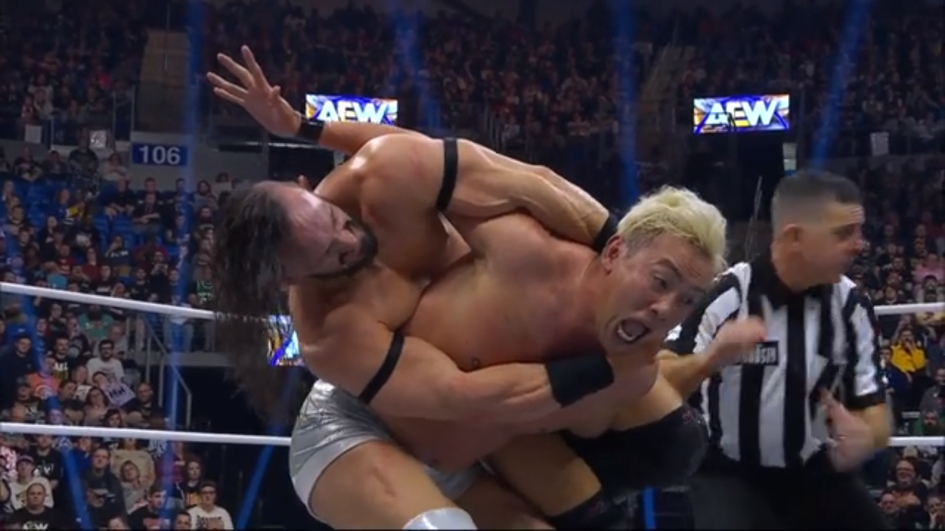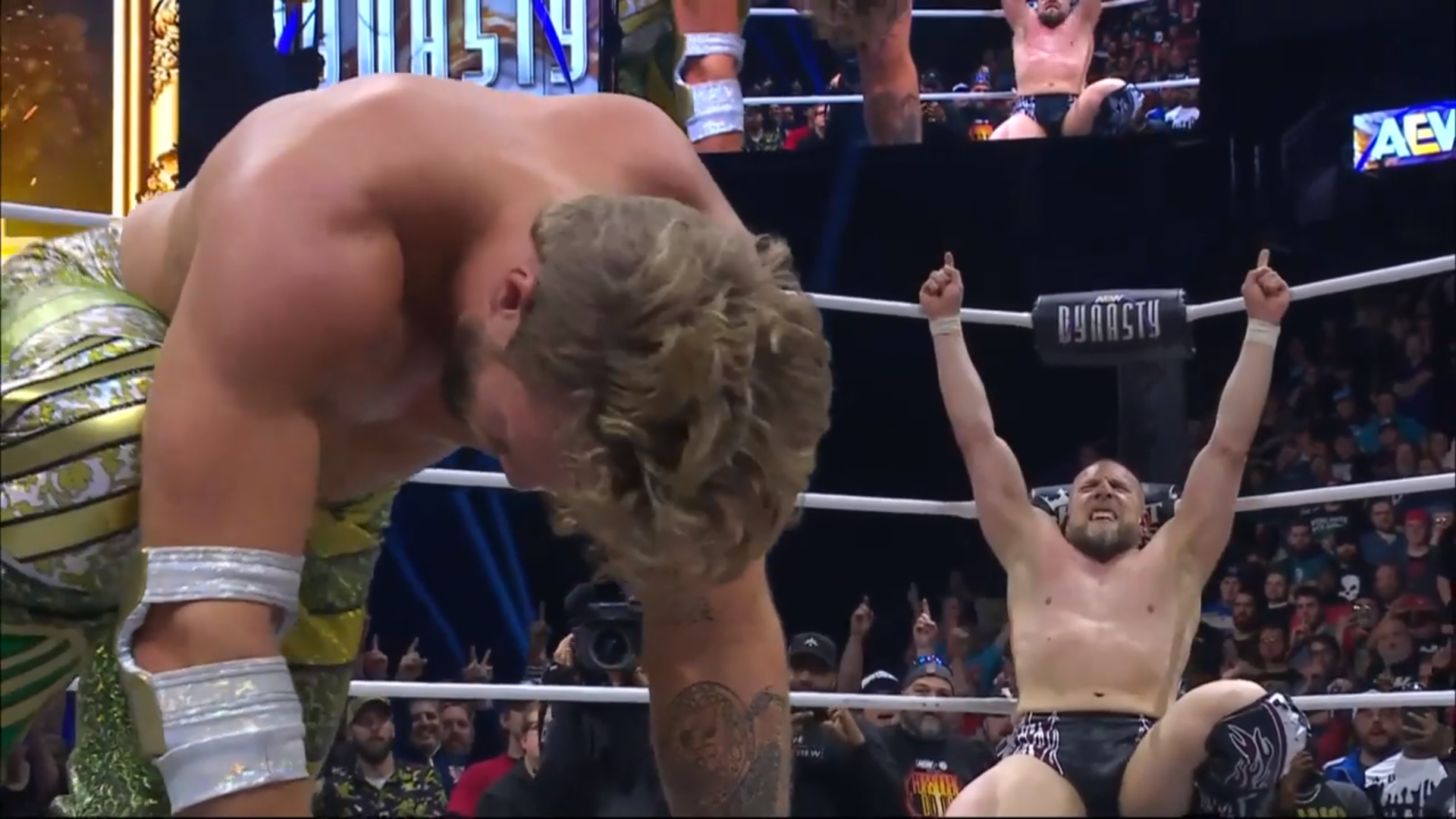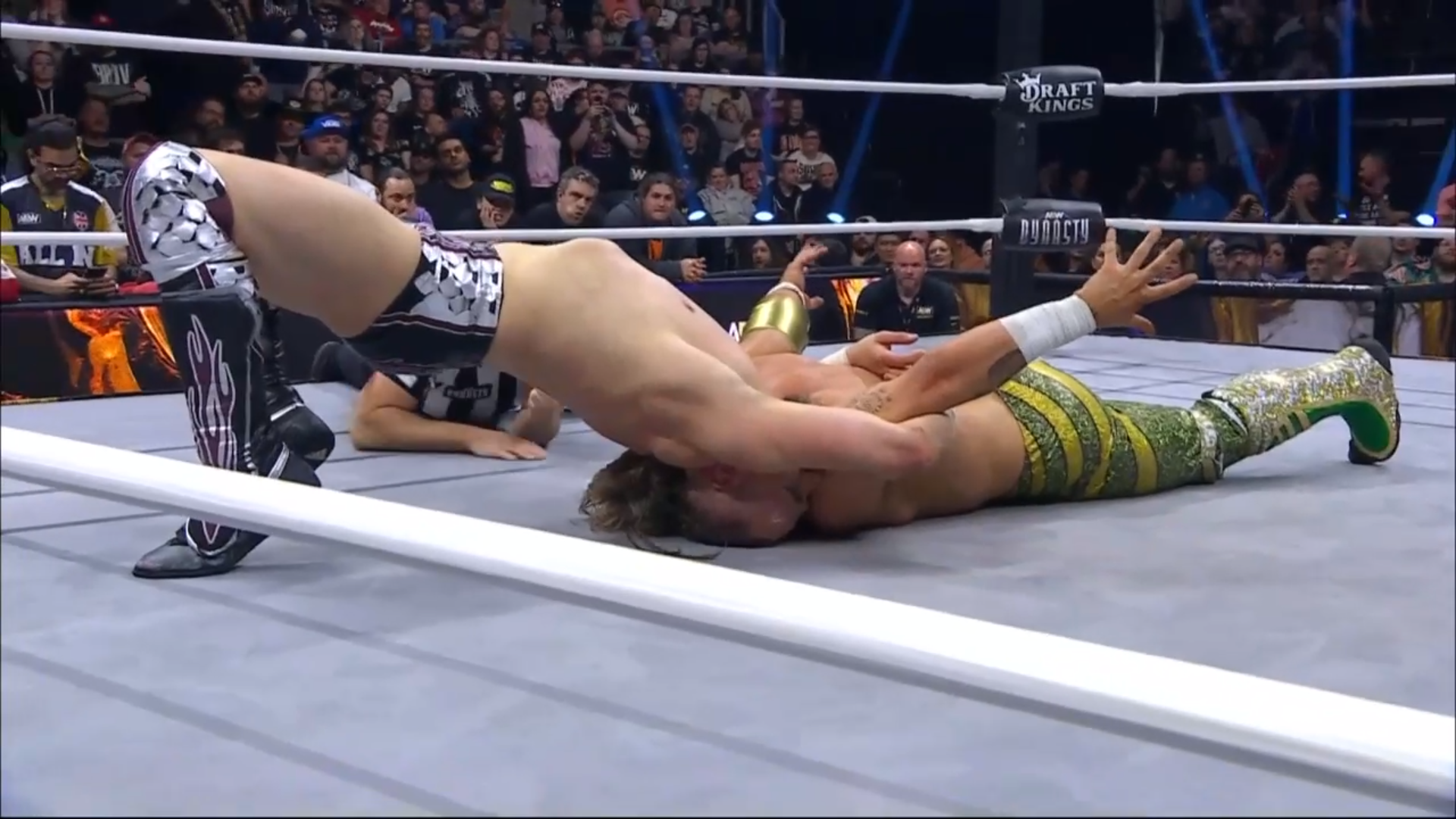 The crowd chant “go home, Jericho, go home”. In the match, or just fuck off back to Canada? Jericho’s approach to this feels like he’s having a comedy match and Hook isn’t. The plunder is hit and miss. The mass of suplexes don’t feel right. The crowd start chanting “please retire” to give you an idea of how bad the match is. Hook isn’t helping matters. He’s awful here. His bumps look like shit. Basically, it’s not good for anyone. No one benefits from this. Least of all Tony Khan, who needs to put Jericho on the backburner.