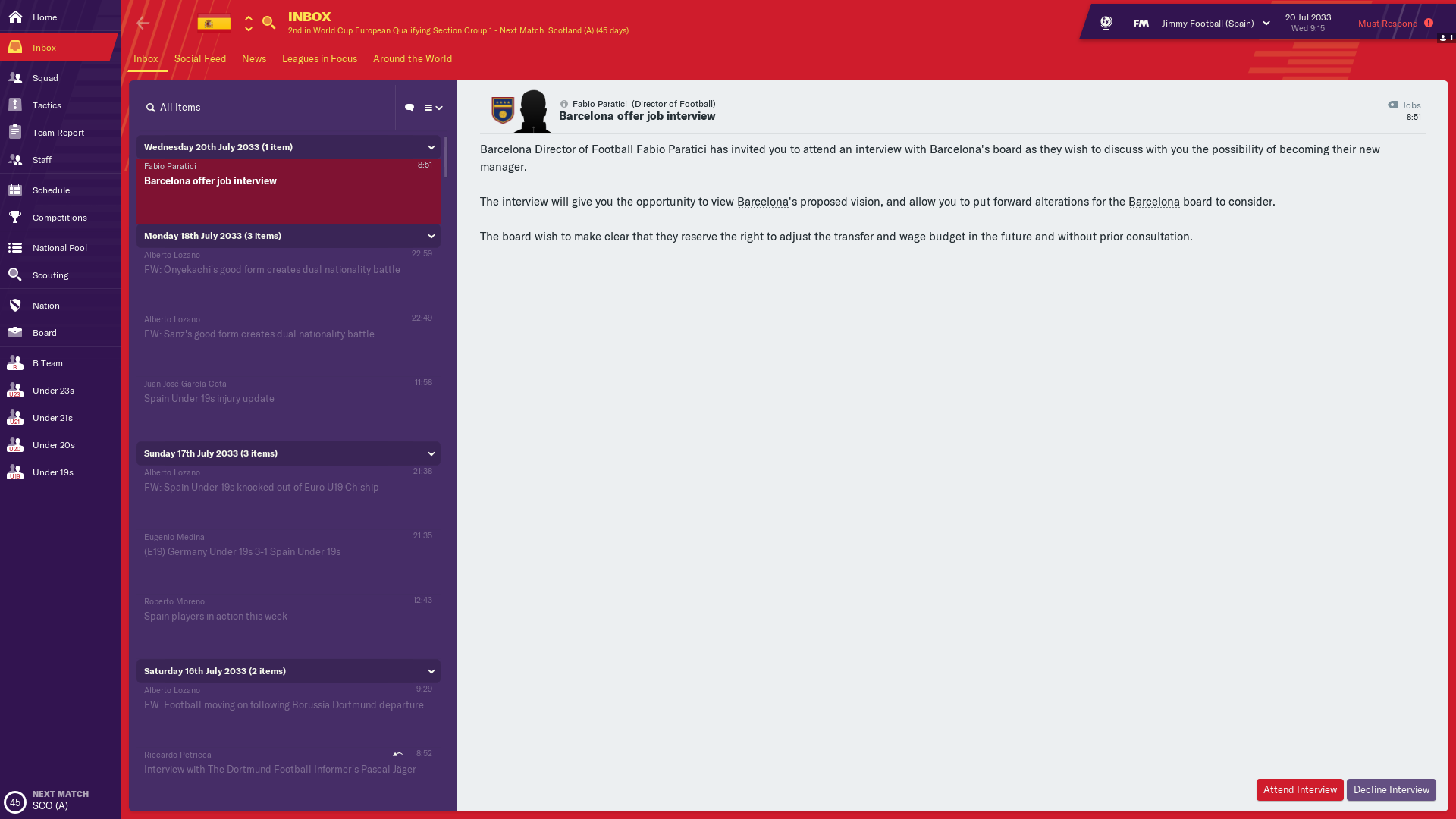 As I left you last time out Brian Hates-Liverpool had gone to Bayern Munich and as a result resigned as Dortmund manager with Jimmy Football. I consider two teams in the same league to be a conflict of interests even trying to avoid interfering with the other team so hey, he’s had to leave. Bayern is an excellent chance to win everything in Germany and clean up in Europe as well. This left Jimmy Football without a job. The Benfica job was still open but I couldn’t apply for it because the deadline had passed, or something, and Laurent Blanc had it away. But what’s this? A job interview?