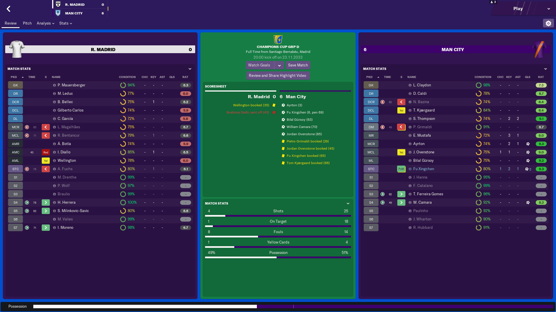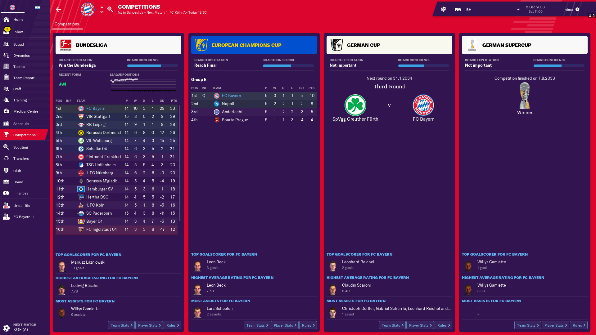 It’s not been perfect but having managed a team in the Bundesliga it’s a league that can easily be dominated by Bayern. Currently four points clear, with a game in hand on second placed Stuttgart. Dortmund haven’t lost yet but they also draw loads of games 0-0 because the manager is a defence-minded asshole (Bruno Genesio, the twat from PSG). I bet the fans can’t stand him. Champion’s League there was a minor complication away at Napoli but otherwise an easy enough qualification for the knock outs.