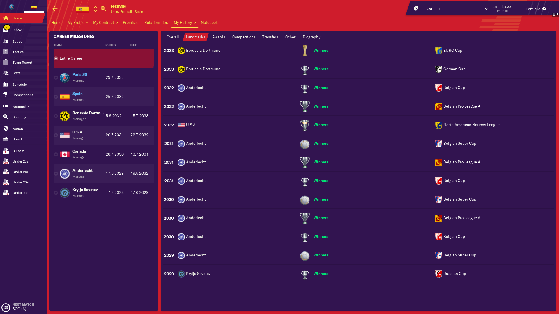 No offence but that’s Brian Hates-Liverpool’s sloppy seconds and I’ve finished Spain. I’ve completed it mate. Barca did an easy double. There’s nothing to prove there. I appreciate it, honestly I do, but no. Then Bruno Genesio decided to leave PSG to manage my old club Borussia Dortmund. I am interested in taking over PSG? Of course. It’s a bloody trope. It’s a pisstake club (who won the league because two other teams bottled it last year). Meanwhile Diego Simeone leaves Inter, who I had a fierce rivalry with when I was at Juve, for Barca. Can I get the Inter job? I missed out on Serie A by a point. Still need that.