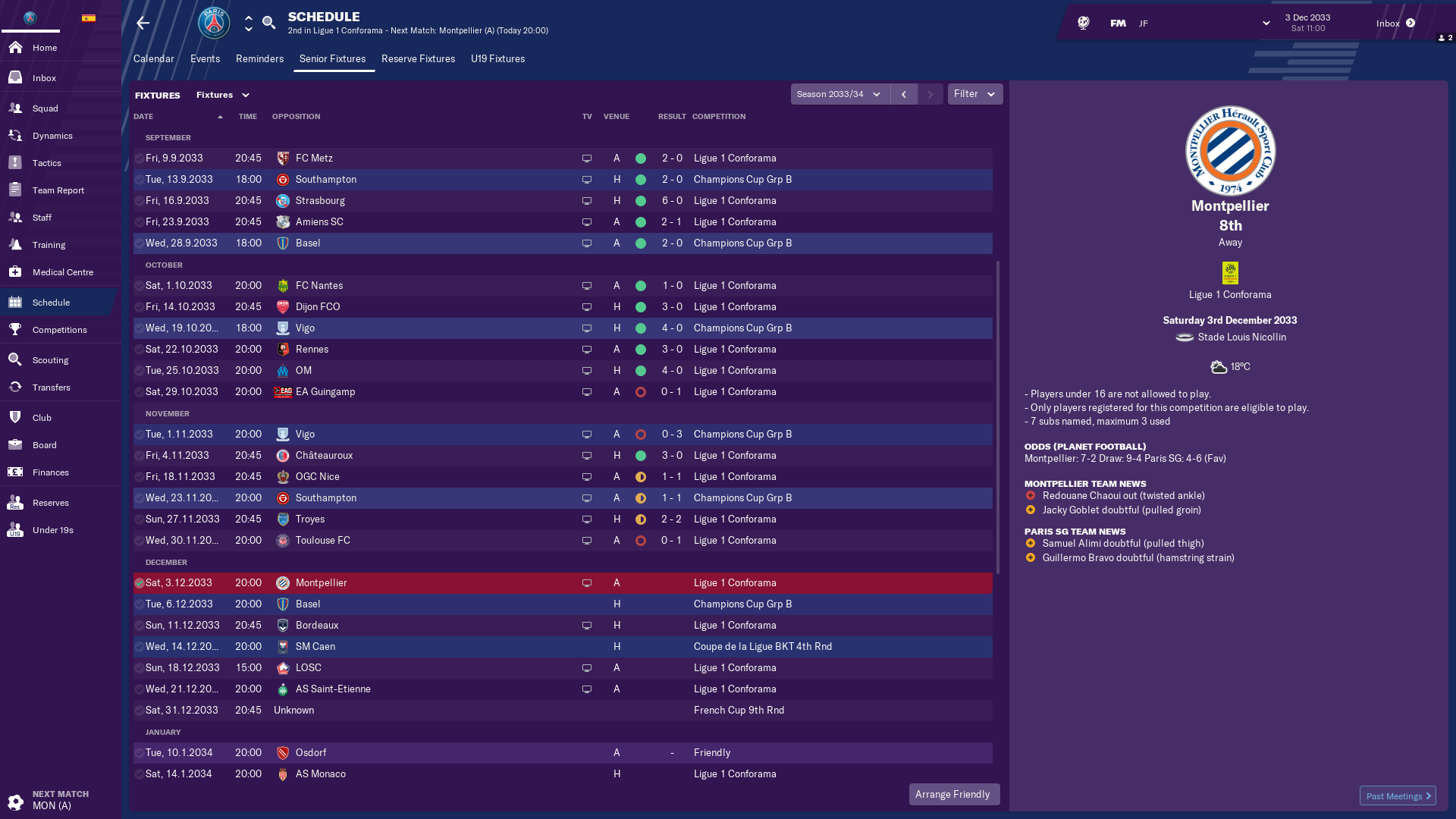 I’ve used the schedule screen to show how badly it’s going. The competitions screen looks strangely fine. Only one win in November. This has coincided with one of the central midfielders getting injured but there has also been a mess of players desperate for first team football that’s caused needless switching around. Troyes was a massive bottle job. PSG were 2-0 up at half-time and somehow threw that away. The team talk was literally “don’t get complacent”. They come out for the second half and what do I see next to everyone’s name? “COMPLACENT”. Dickheads. Look at that list of results though. Ten wins in a row and then one win from seven? What the fuck lads?